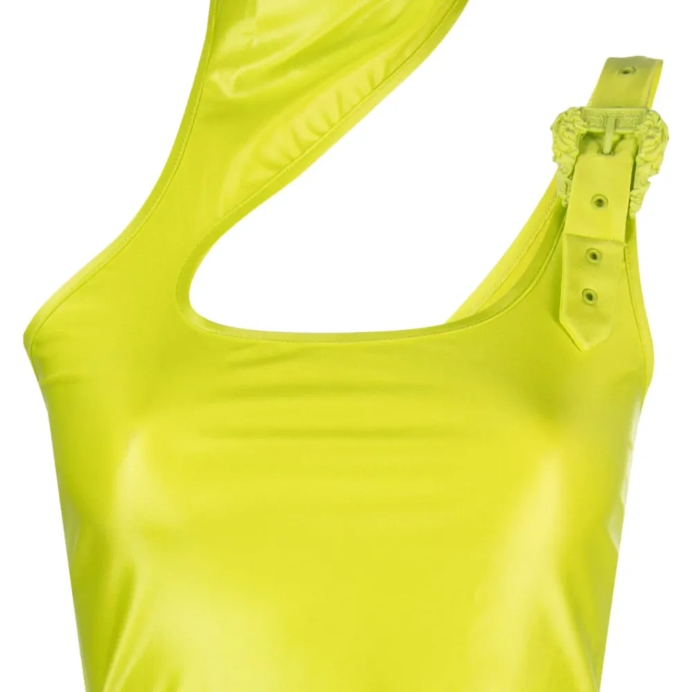 Желтый, эластичный материал, высокий воротник, вырезные детали, декоративная пряжка, без рукавов и укороченная длина.