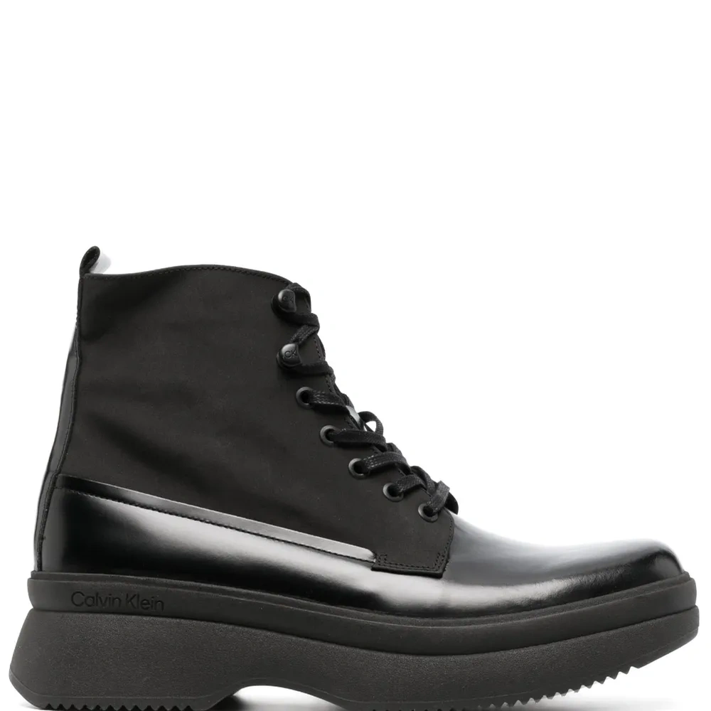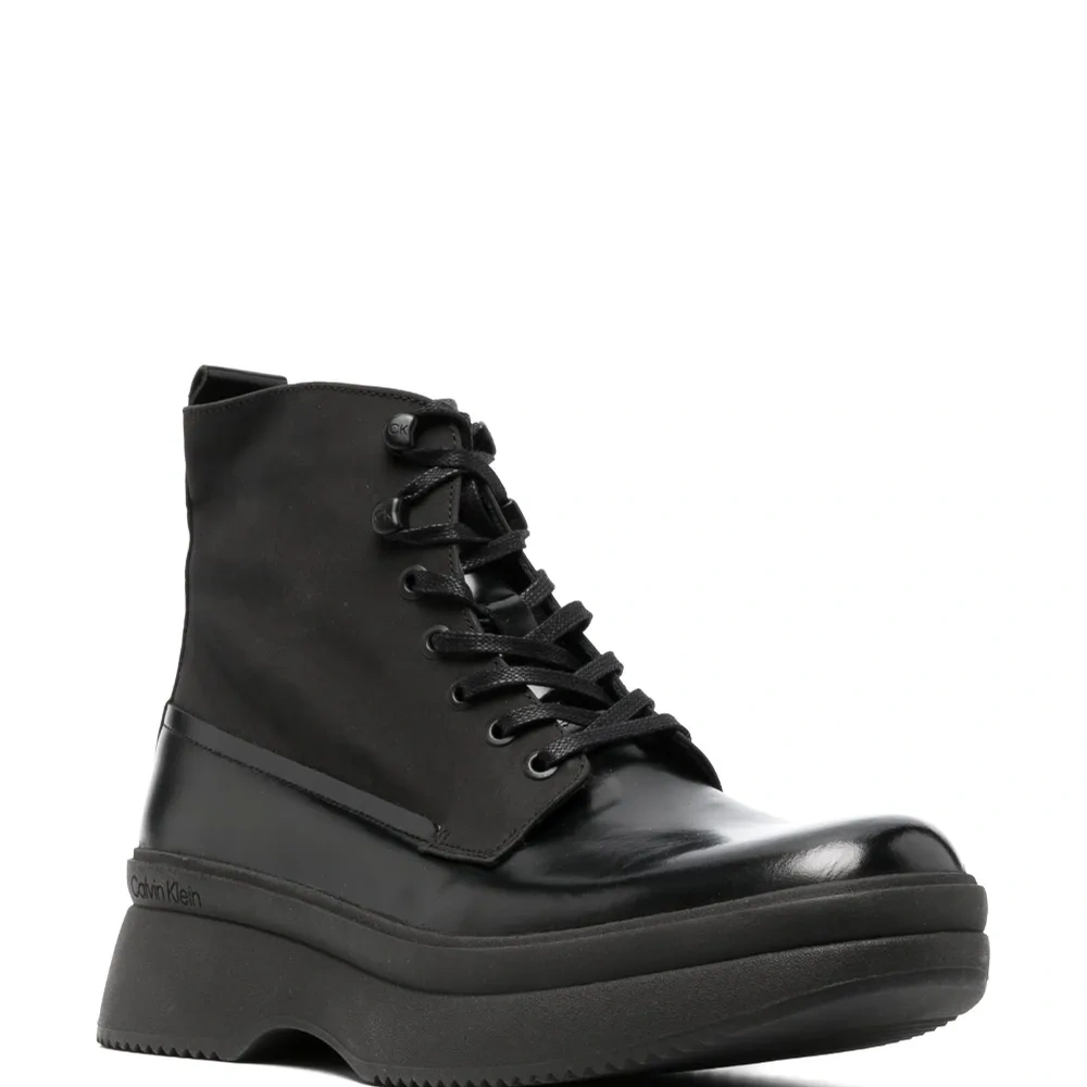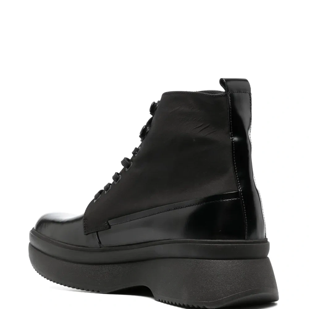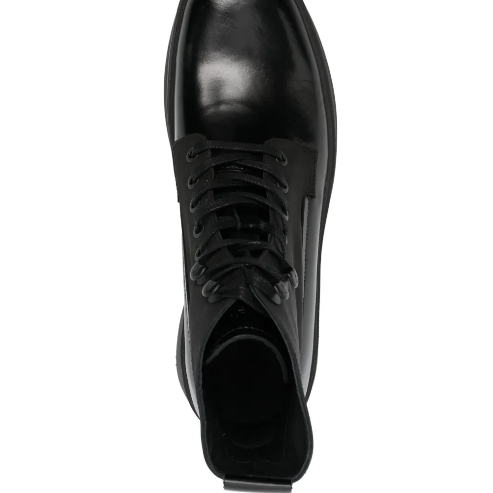Черный, телячья кожа, закругленный носок, шнуровка спереди, петля для подтягивания сзади, высота по щиколотку и массивная резиновая подошва.