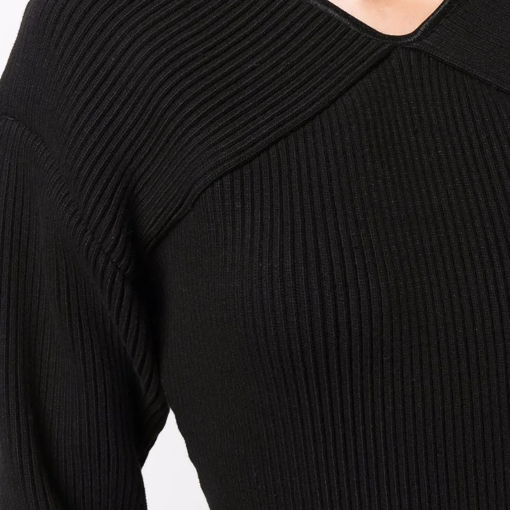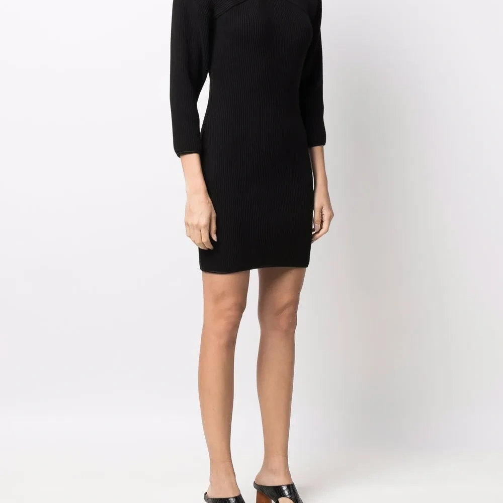 Трикотаж в рубчик, V-образный вырез, рукава три четверти, приталенный силуэт и длина до бедер.
