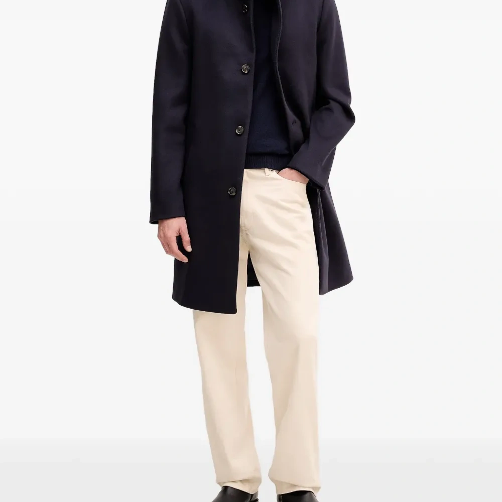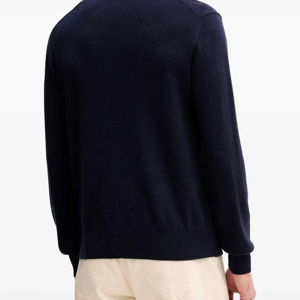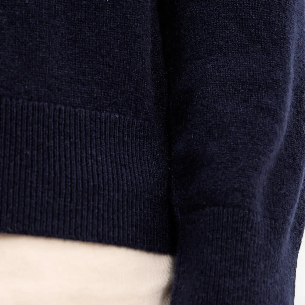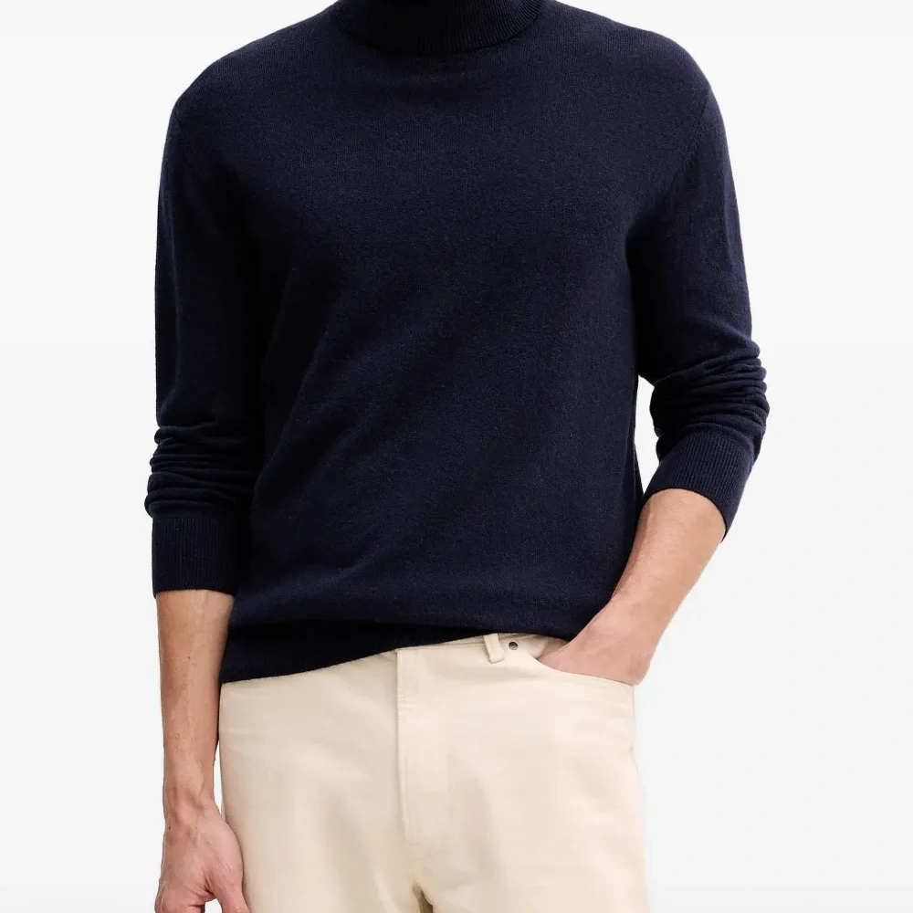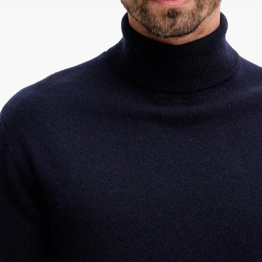 тёмно-синий свитер с воротником-гольф, рубчатой вязкой, длинными рукавами, рубчатым нижним краем и манжетами