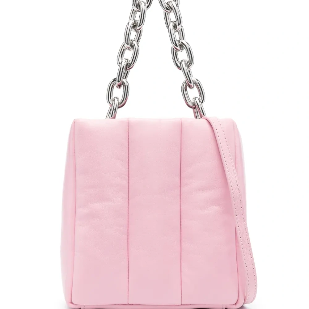 Розовый, овечья кожа, стеганые вставки, цепочный ремень, серебристая фурнитура, съемный регулируемый ремень на плечо, дизайн с открытым верхом, основное отделение, нашивка с логотипом внутри и внутренний карман на молнии.
