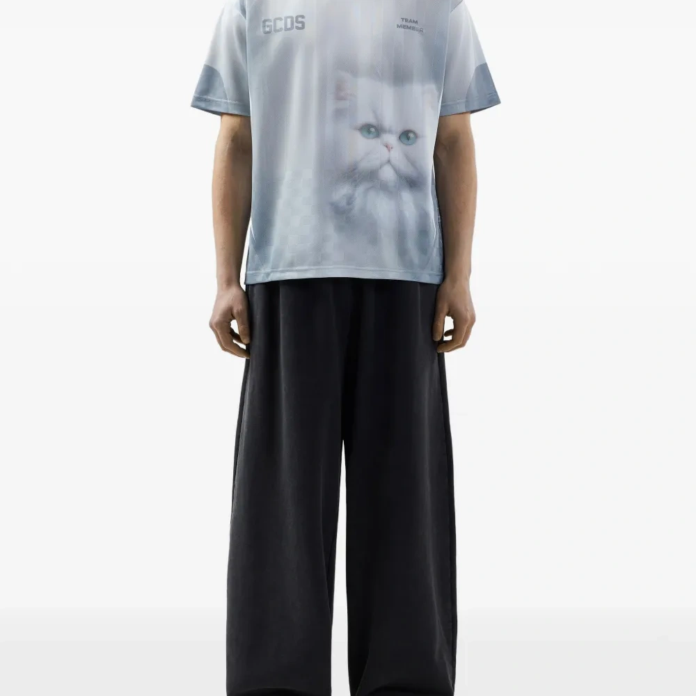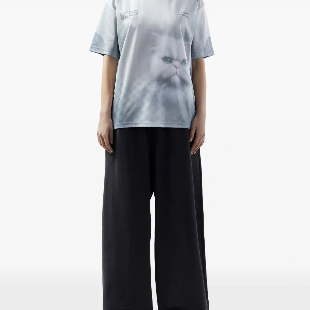 белая оверсайз футболка с принтом котенка, короткими рукавами и круглым вырезом