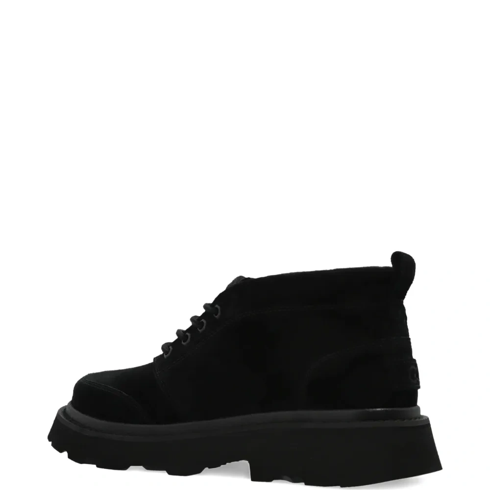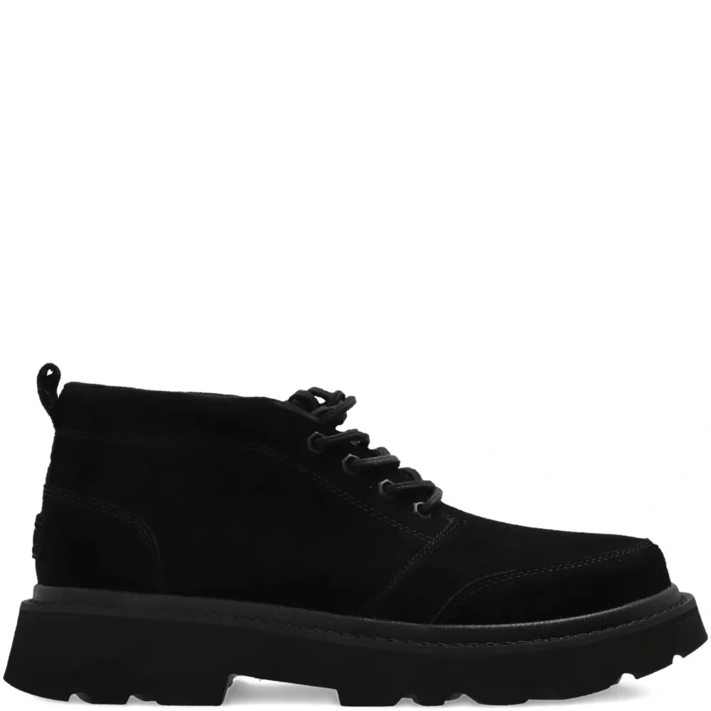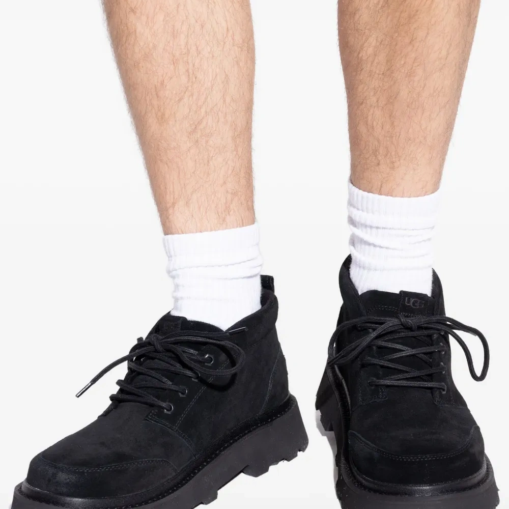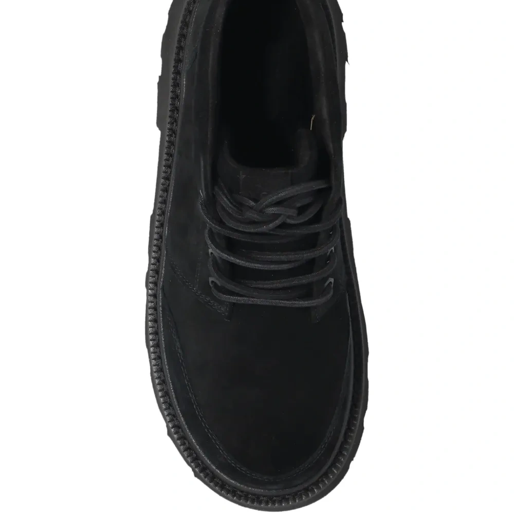 верх из черной телячьей замши, шнуровка, петля на пятке, подошва-платформа, рифленая подошва