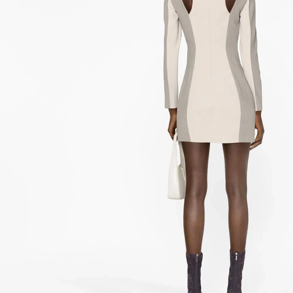 Бежевый, светло-серый, сочетание двух оттенков, квадратный вырез, вырезные детали, длинные рукава и длина до бедер.