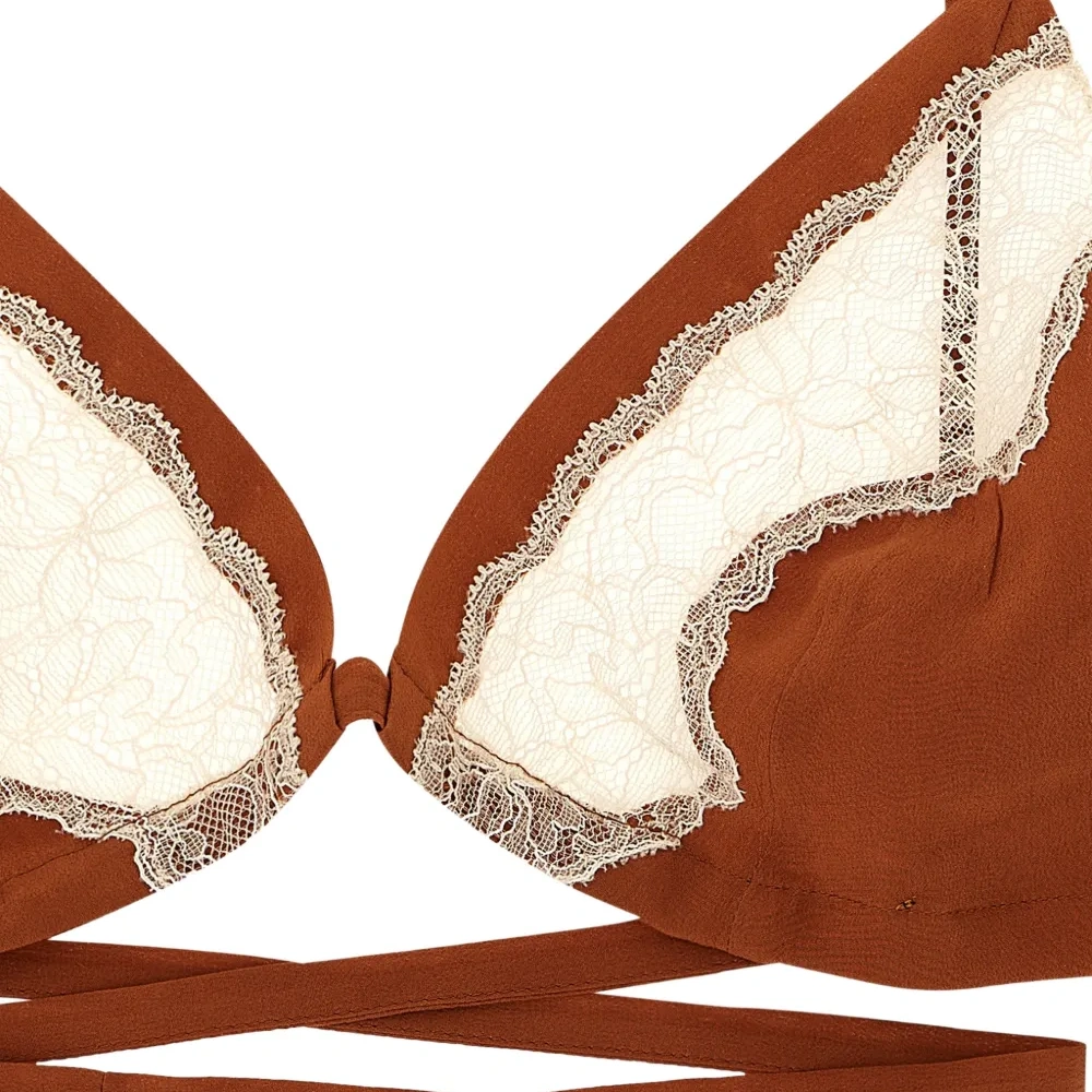 коричневый топ с кружевной вставкой, завязками, регулируемыми и скользящими бретелями в стиле треугольник