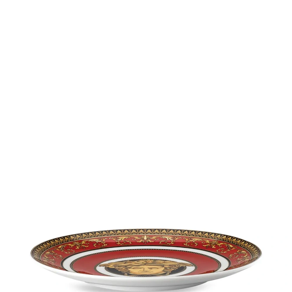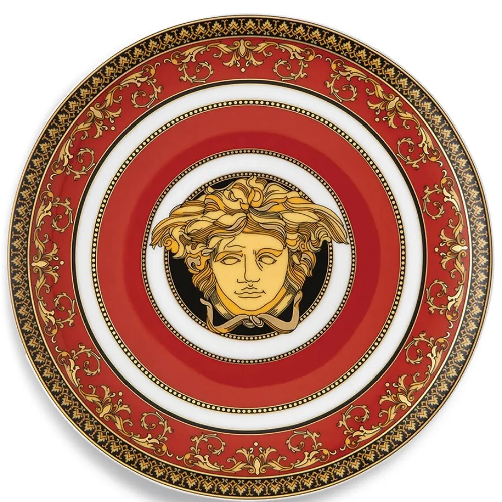 Красный, белый, золотистый, фарфор, узор Medusa Head, узор в стиле барокко и модель круглой формы.