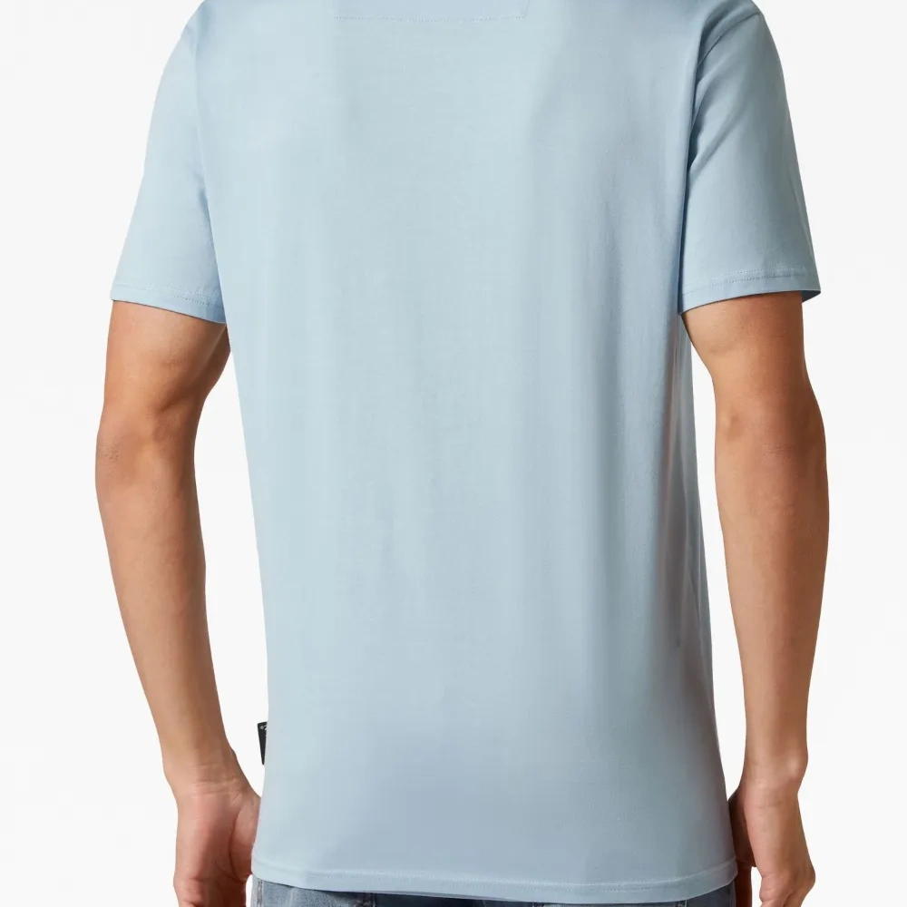 Голубой, хлопок, принт с логотипом на груди, нашивка с логотипом сзади, круглый вырез, короткие рукава и прямой подол.