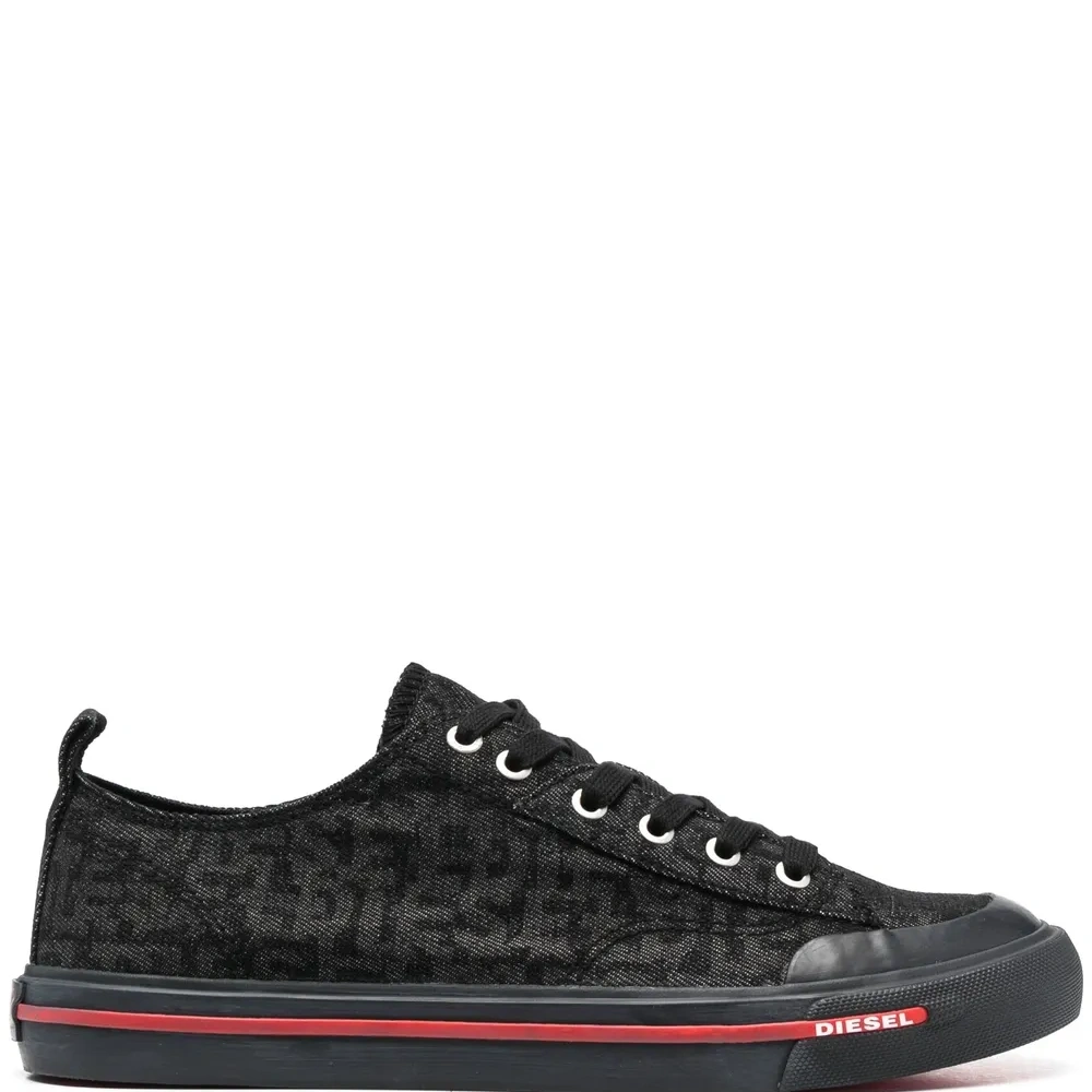 Черный, парусина, сплошной принт с логотипом, закругленный носок, шнуровка спереди, петля для подтягивания сзади и плоская резиновая подошва.