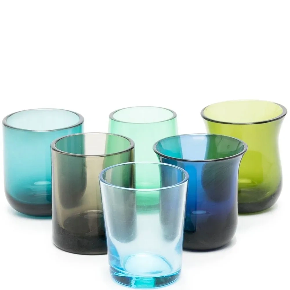 Синий, зеленый, стекло, подходит для мытья в посудомоечной машине и набор из шести предметов. Внешний вид вещей в комплекте различается — это часть дизайна.