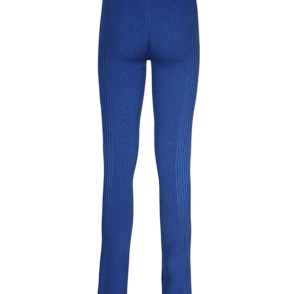 ярко-синий цвет, ребристая текстура, расклешённые брюки, высокая талия, застёжка-клипса, детали в виде мордочки монстра