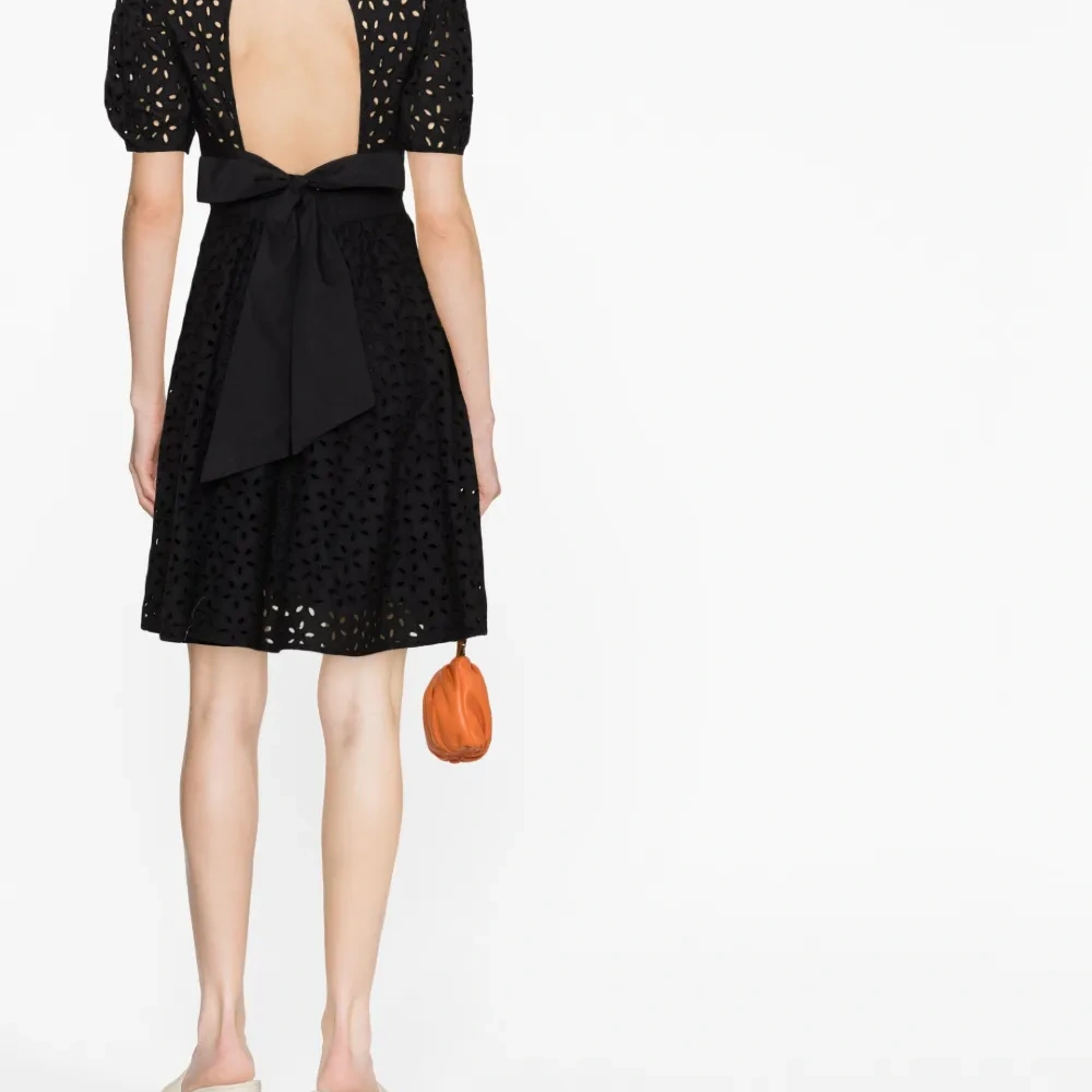 Черный, хлопок, английская вышивка, перфорированная модель, края с фестонами, V-образный вырез, короткие рукава, застежка на пуговицу сзади, застежка на завязке сзади, открытая спина, прямой подол и длина выше колена.
