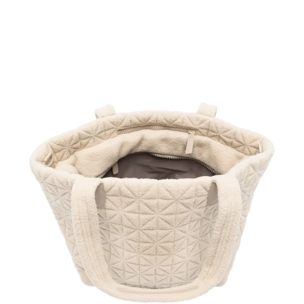кремовая сумка с тиснением под овчину, геометрической простежкой, верхней ручкой и застежкой-молнией