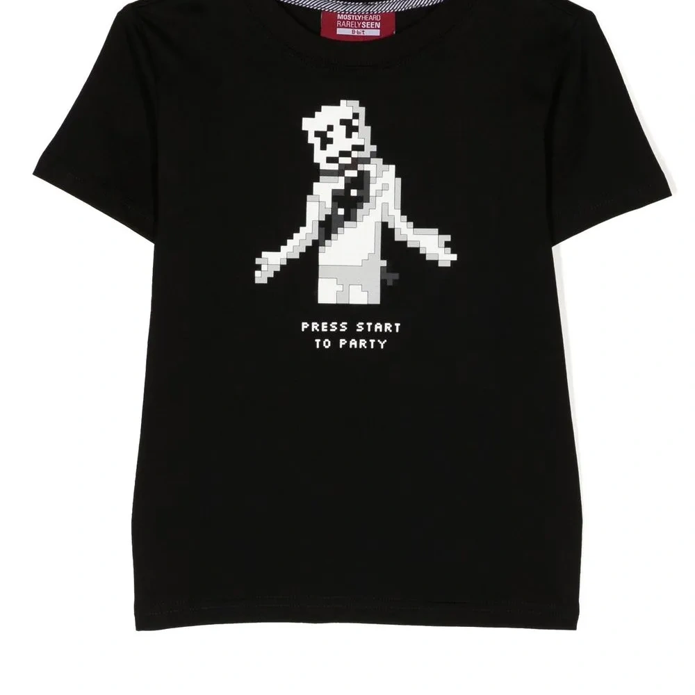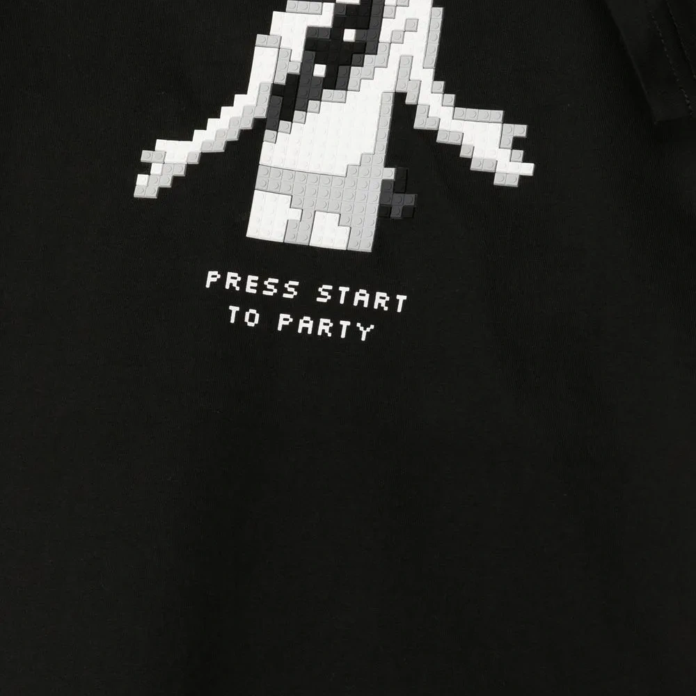 Черный/белый, хлопок, ткань джерси, пиксельный принт, текстовый принт, бирка с логотипом, круглый вырез, короткие рукава и прямой подол.