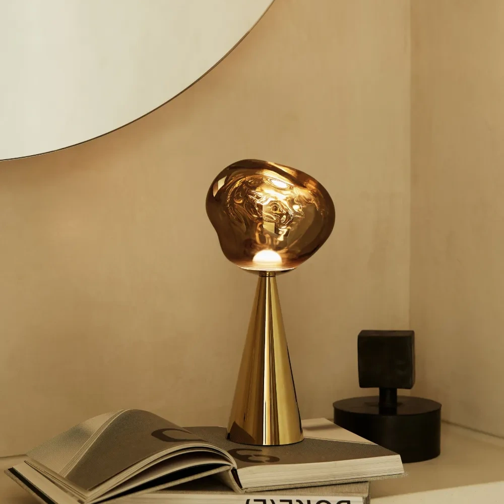 Золотистый, глянцевый эффект, круглая форма и каблук в форме конуса.