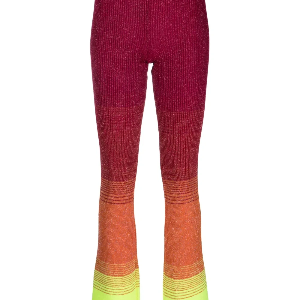 Фуксия, оранжевый, желтый цитрон, трикотаж в рубчик, эффект потертости, золотистый металлический логотип, завышенная талия и расклешенный крой.