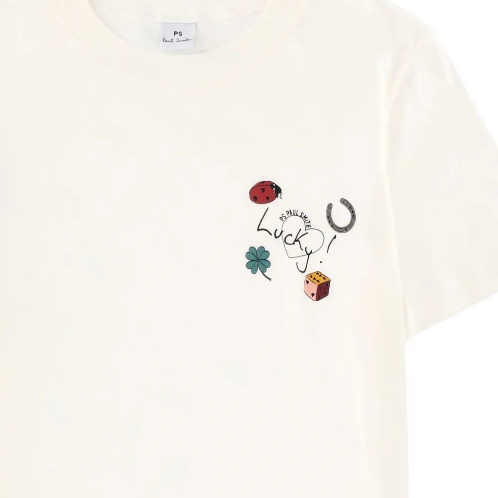 белая футболка с графическим принтом, круглым вырезом и короткими рукавами