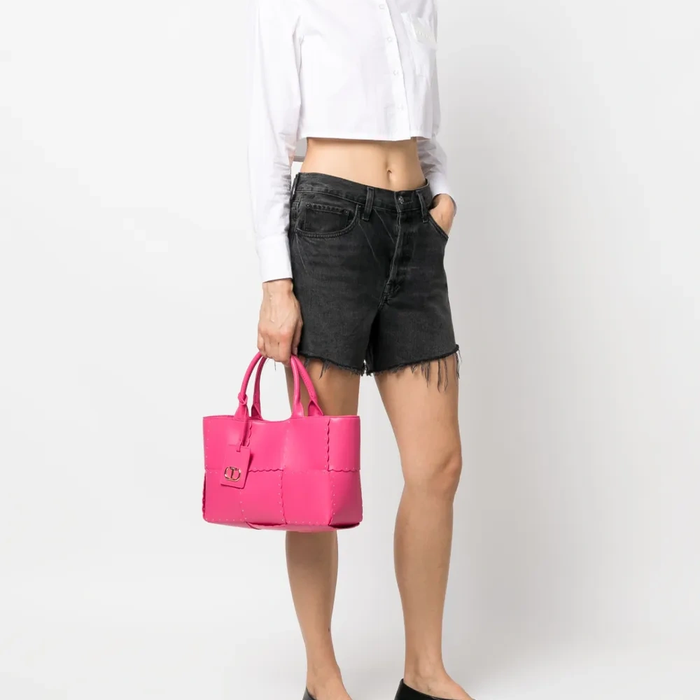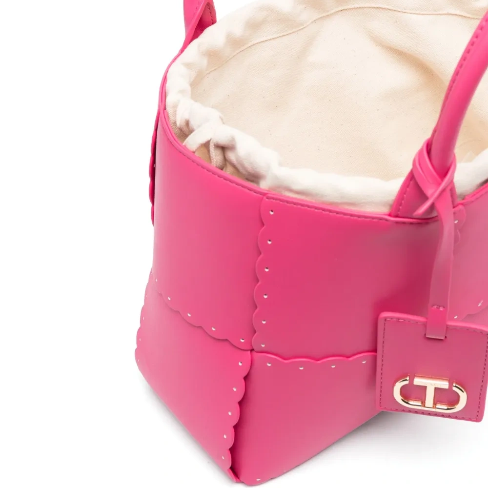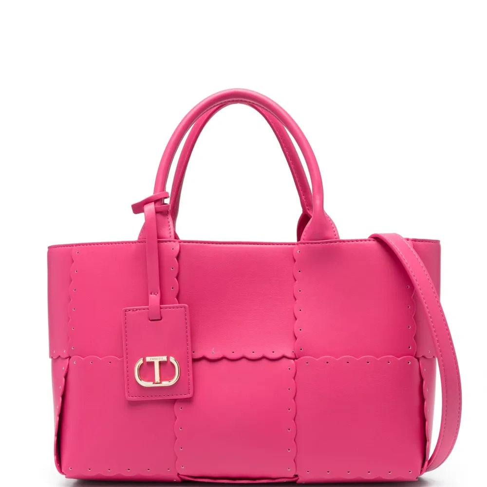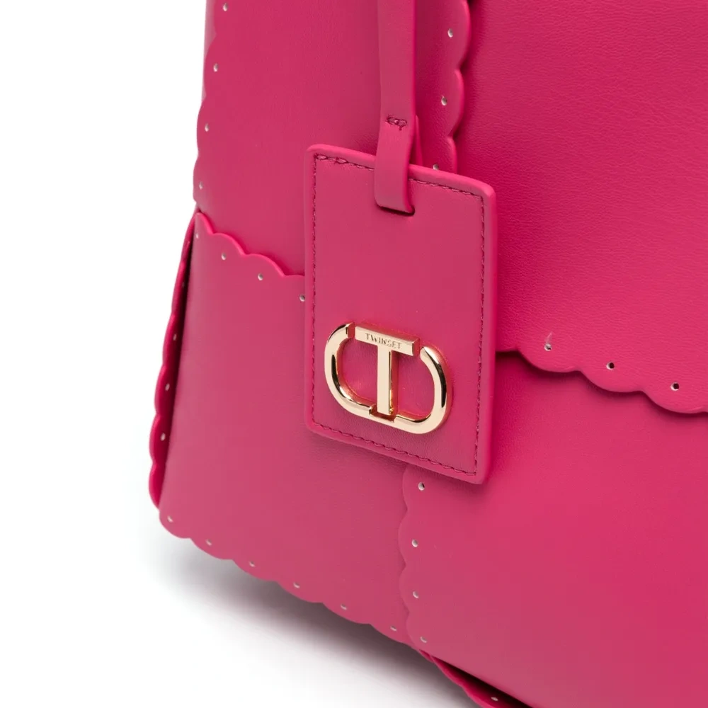 Ярко-розовый, техника пэчворк, нашивка с логотипом спереди, застежка на молнии сверху, две верхние ручки и съемный регулируемый ремень на плечо.