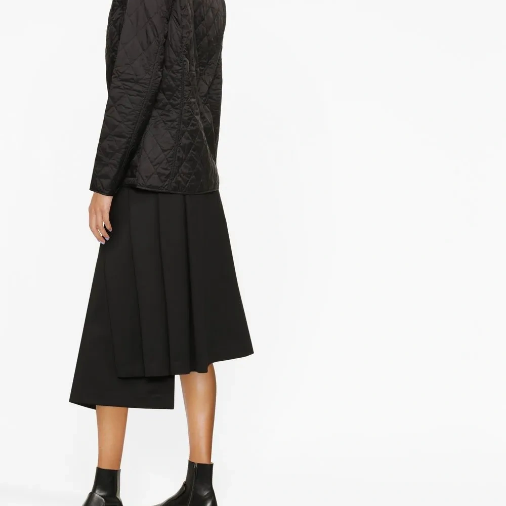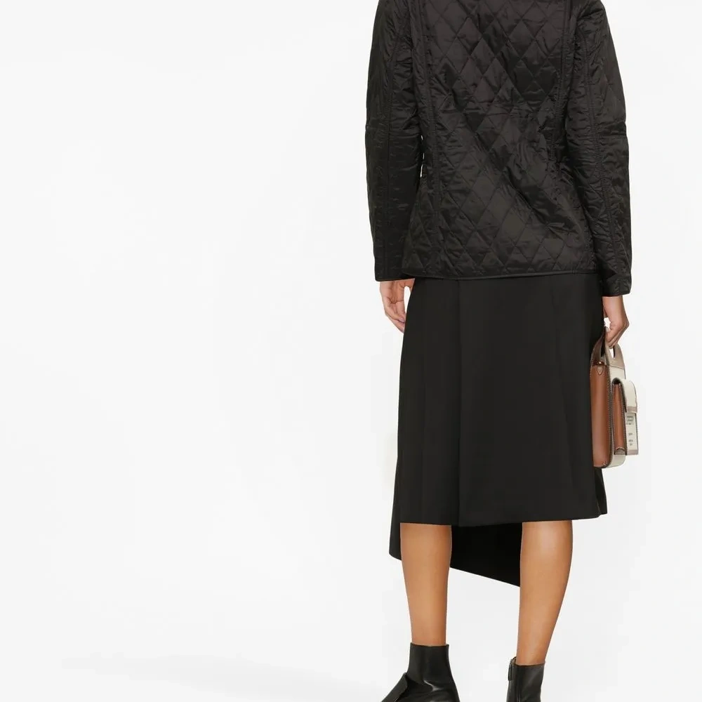 Черный, косой воротник, стеганый материал, чехол с застежкой на кнопку, длинные рукава, два накладных кармана и вышитый логотип.