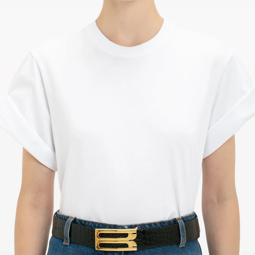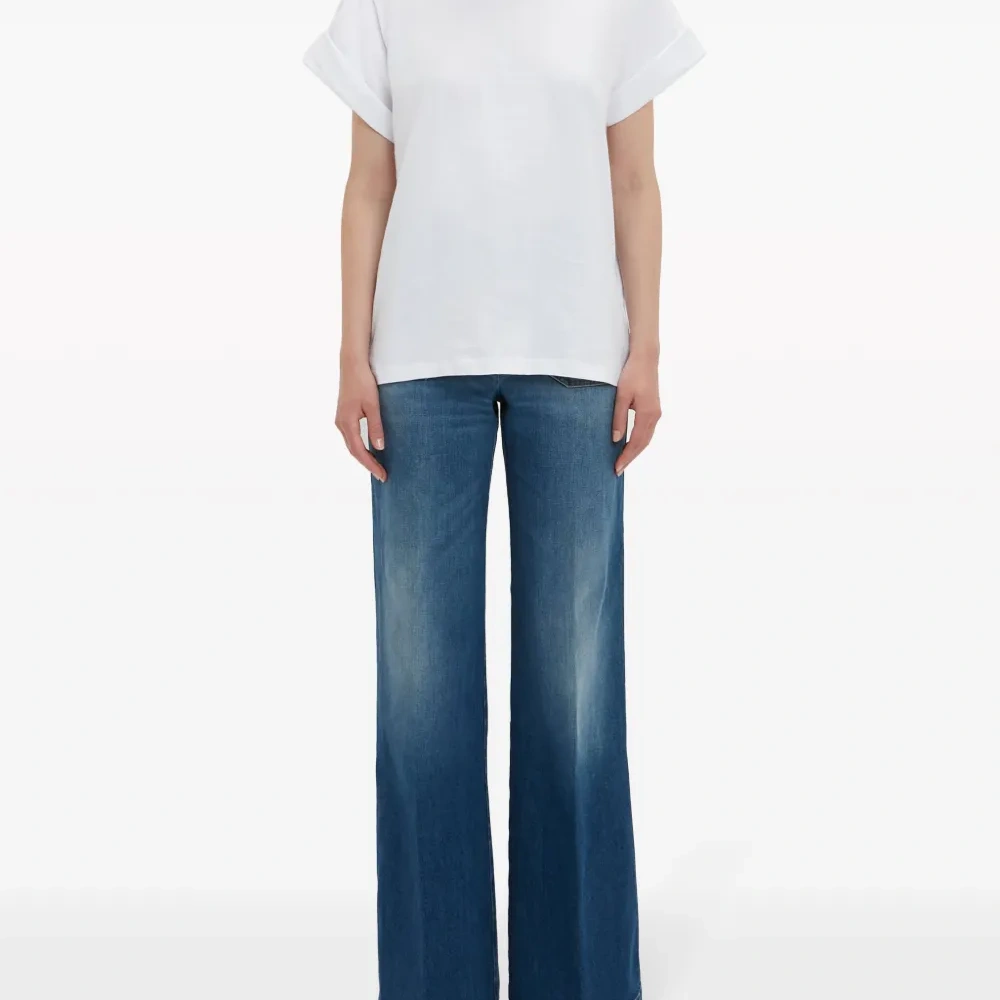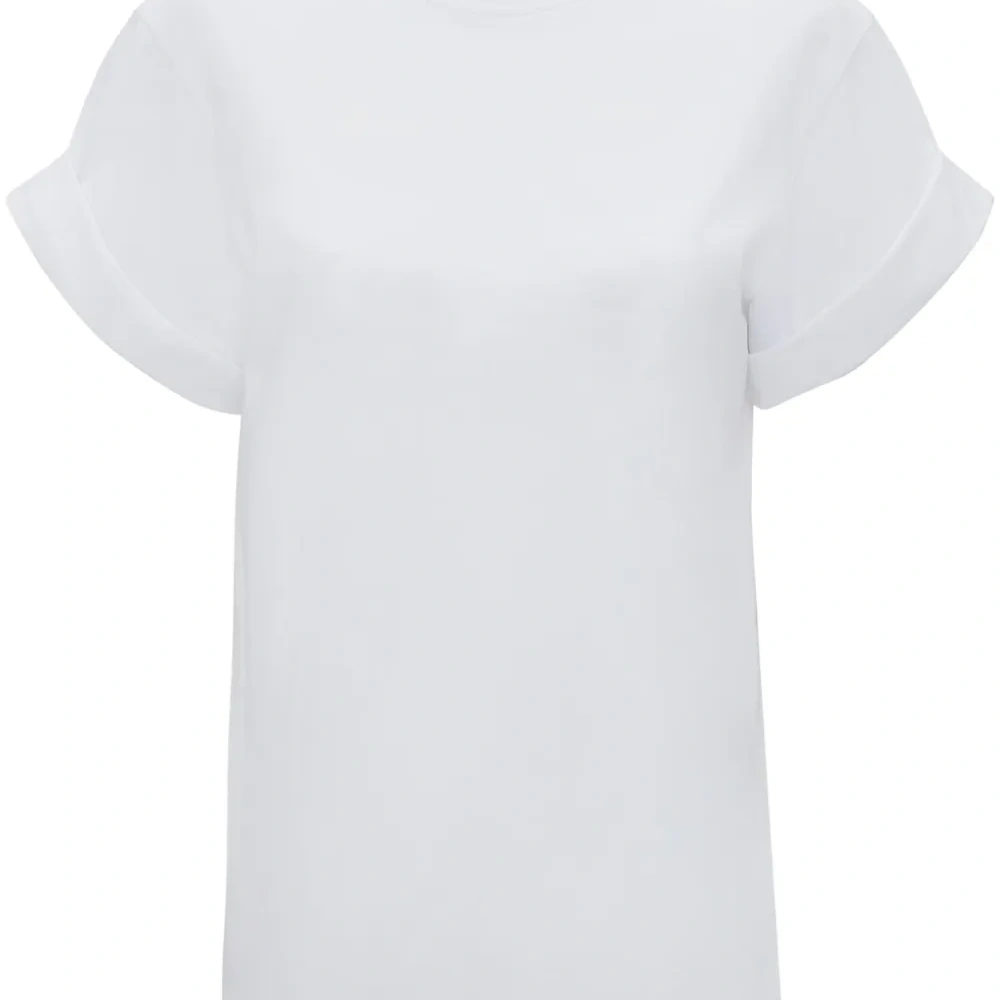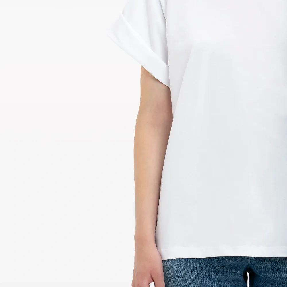 Белый, органический хлопок, вышитый логотип сзади, круглый вырез, короткие рукава, подвернутые манжеты и прямой подол. Узнать больше о том, какие товары получают отметку «Ответственный выбор», можно из материала «Как мы оцениваем экологичность и этичность».
