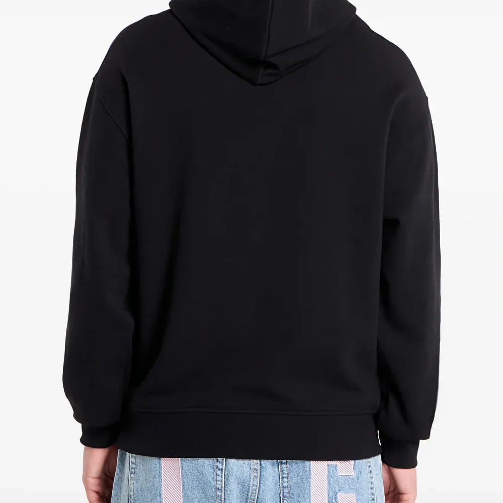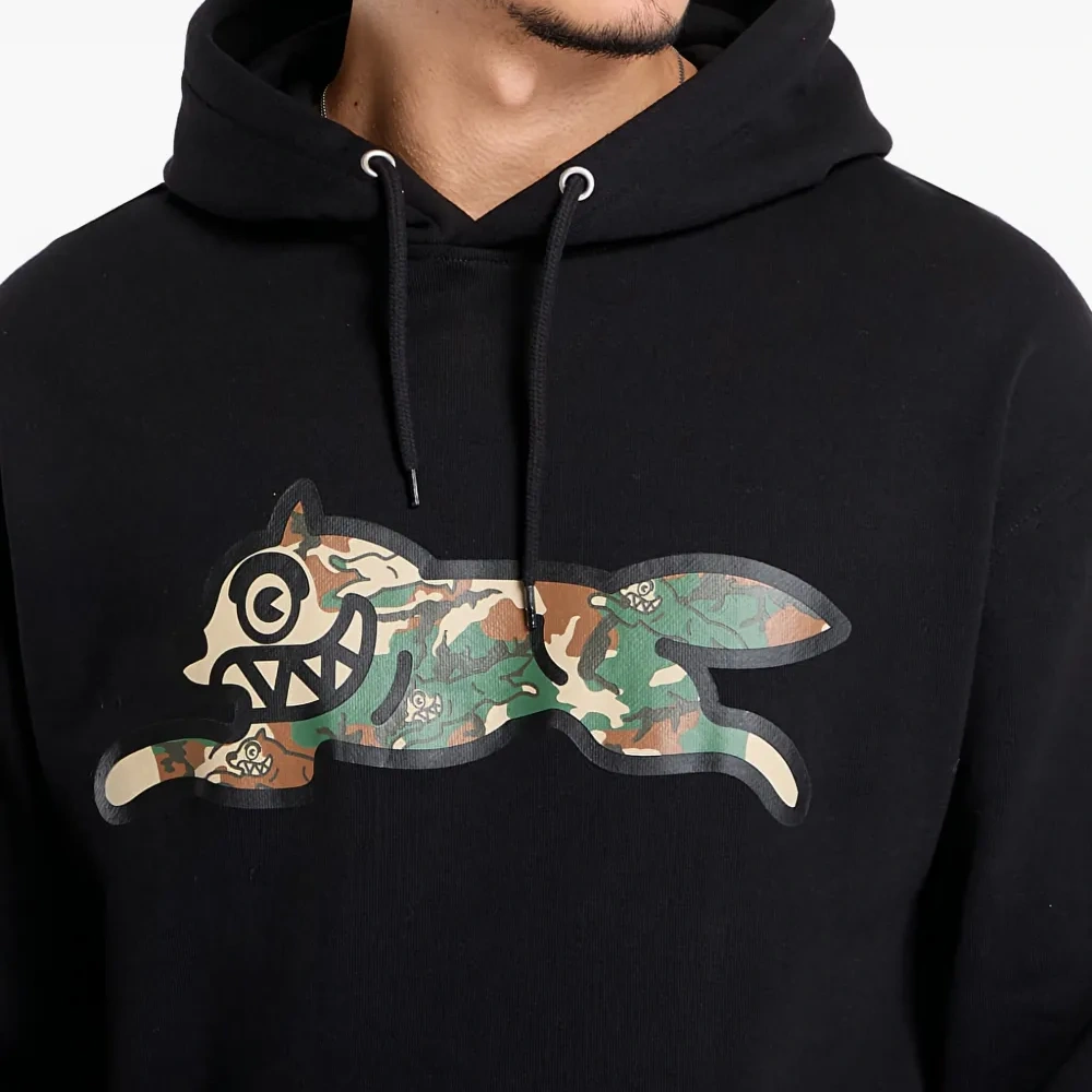 черная толстовка с камуфляжным принтом, кулиской на капюшоне, карманом-кенгуру и нашивкой с логотипом