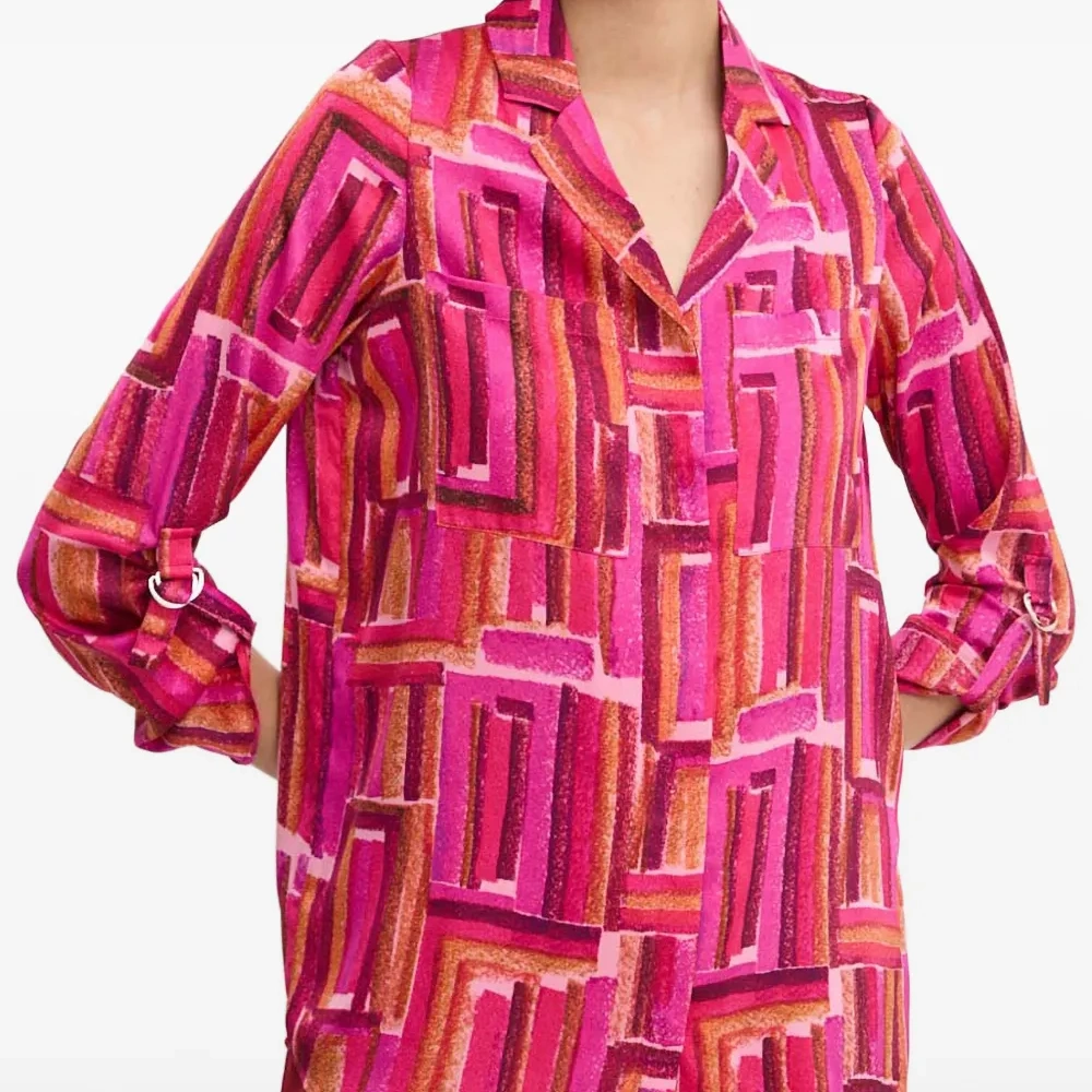 розовая рубашка с геометрическим принтом, отложным воротником, застёжкой на пуговицы, длинными рукавами и патами на рукавах