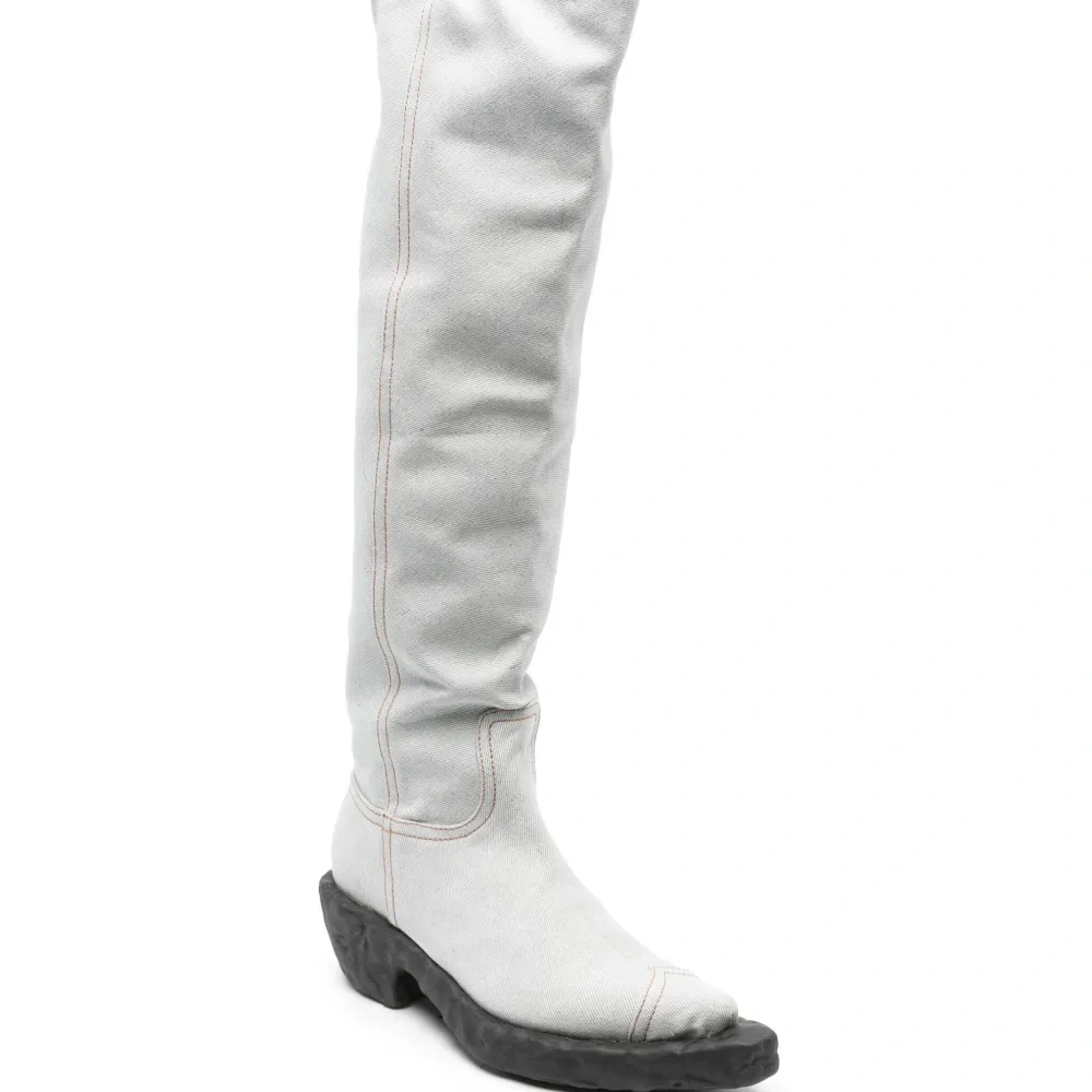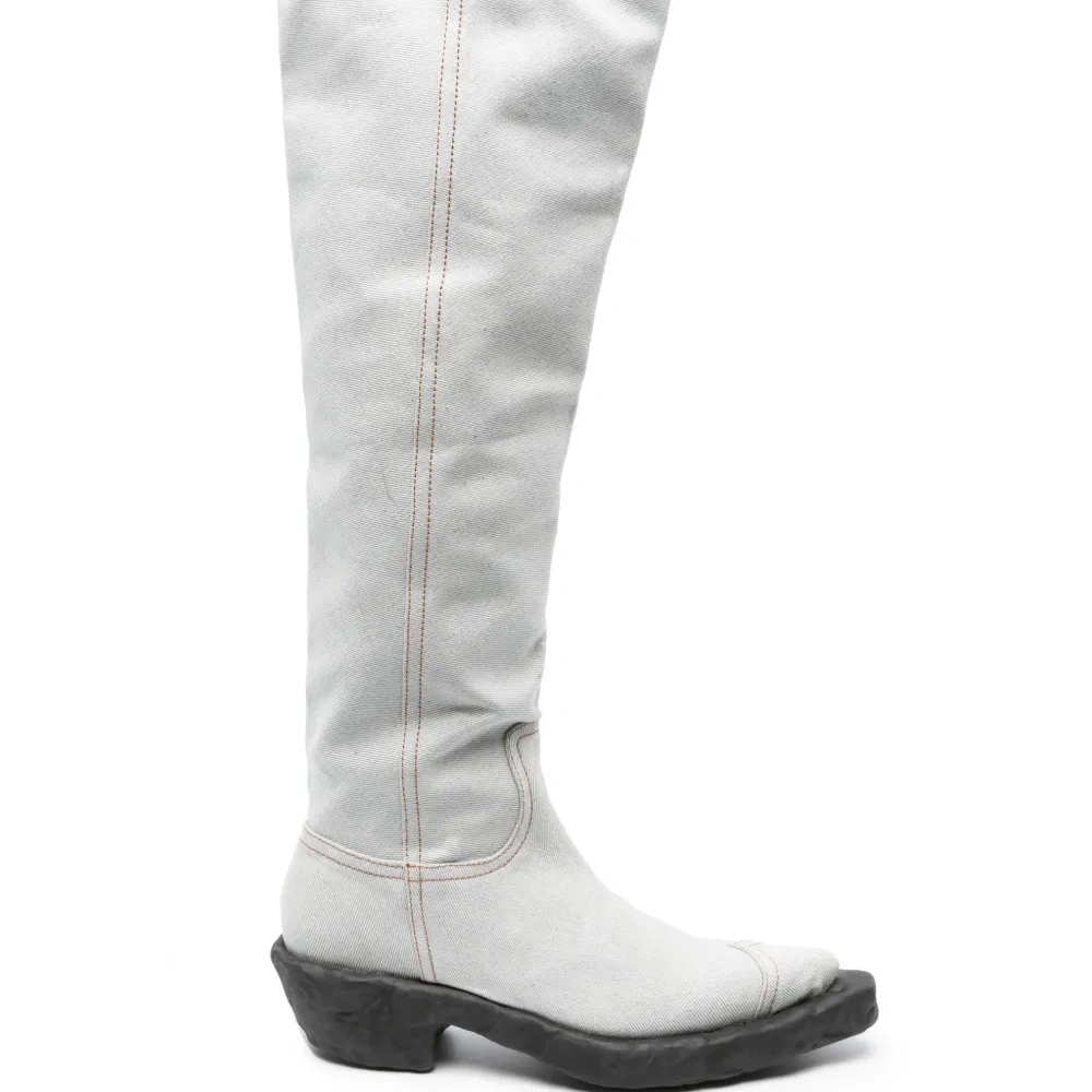 Голубой, угольно-серый, смесовый хлопок, обработанный деним, вставки, контрастная строчка, модель без застежки, заостренный носок, высота по колено, парусиновая подкладка и массивная резиновая подошва.