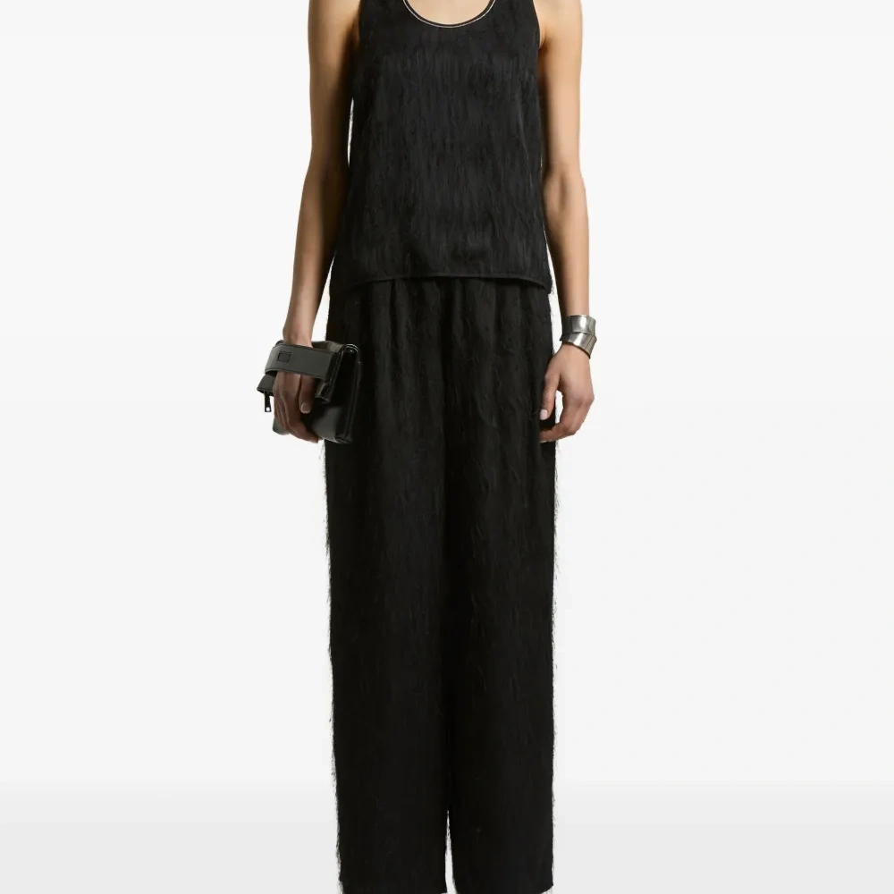 чёрная ткань с текстурой, спортивная спинка, круглый вырез, лёгкий блеск, белая отделка