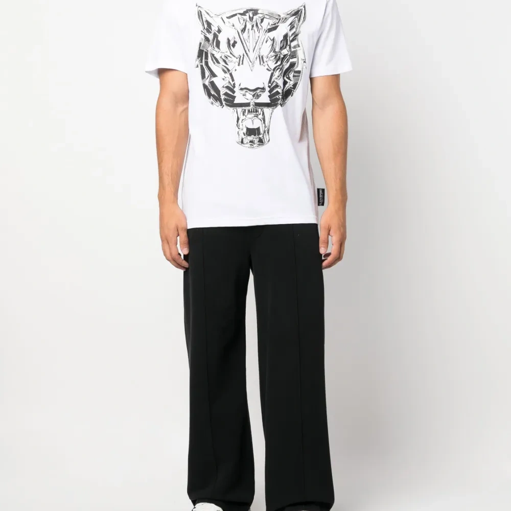 Белый, хлопок, принт с изображением тигра, нашивка с логотипом сзади, круглый вырез, короткие рукава и прямой подол.
