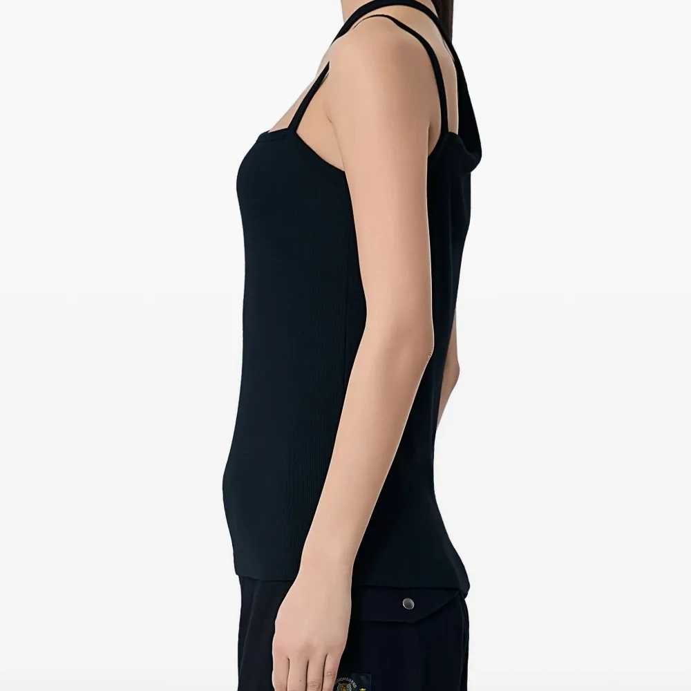 черный топ с асимметричным вырезом, множеством бретелек и прямым подолом