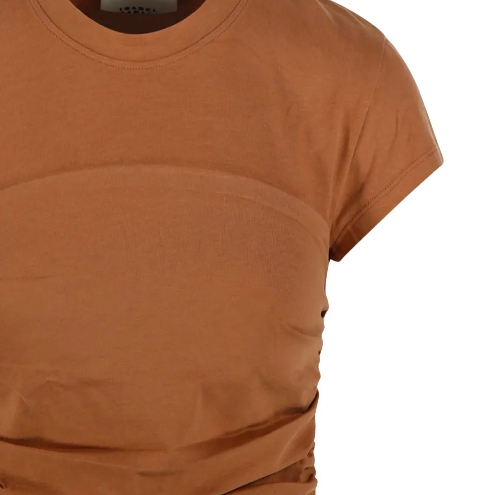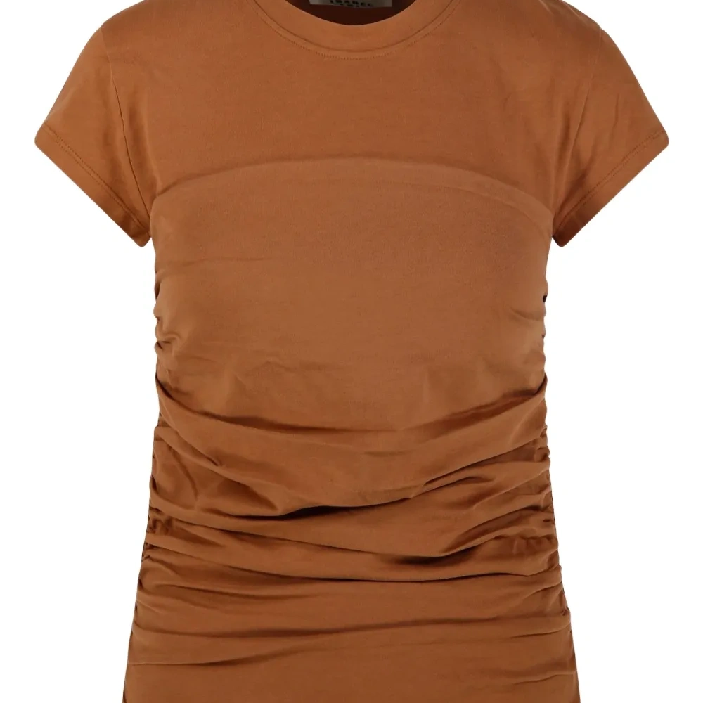 карамельно-коричневый, короткие рукава, круглый вырез, сборка, прямой подол
