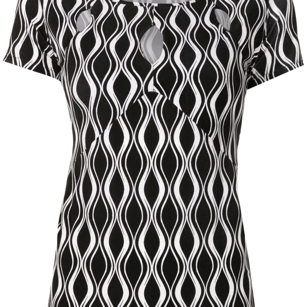 Черный/белый, эластичный материал, волнистый принт, вырезные детали, круглый вырез, короткие рукава и прямой подол.