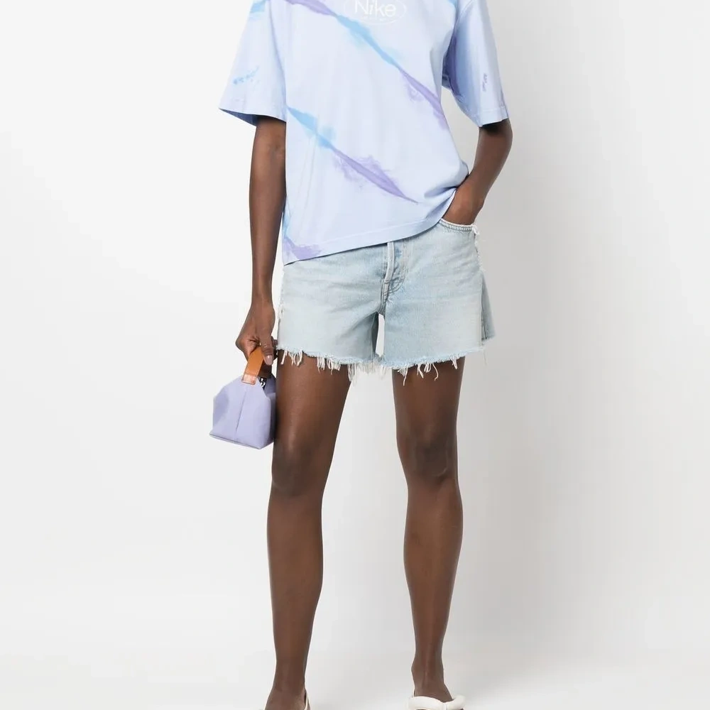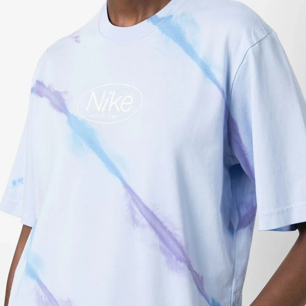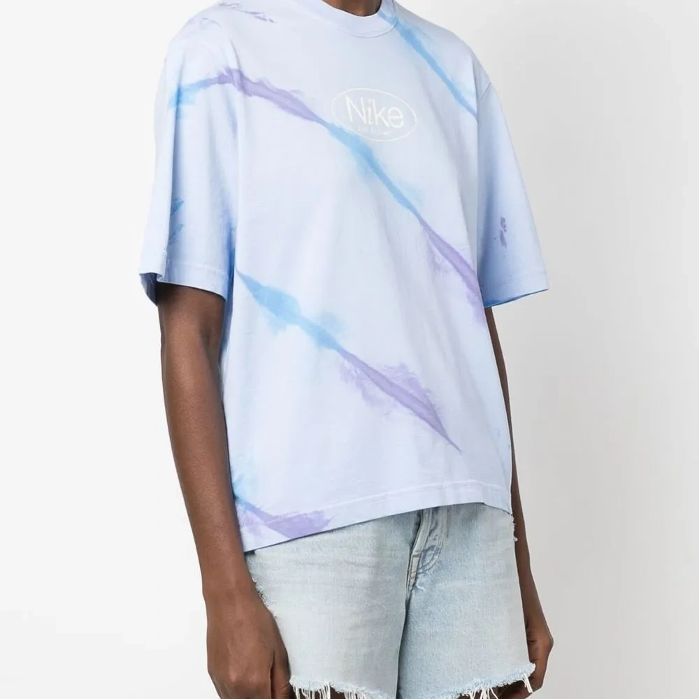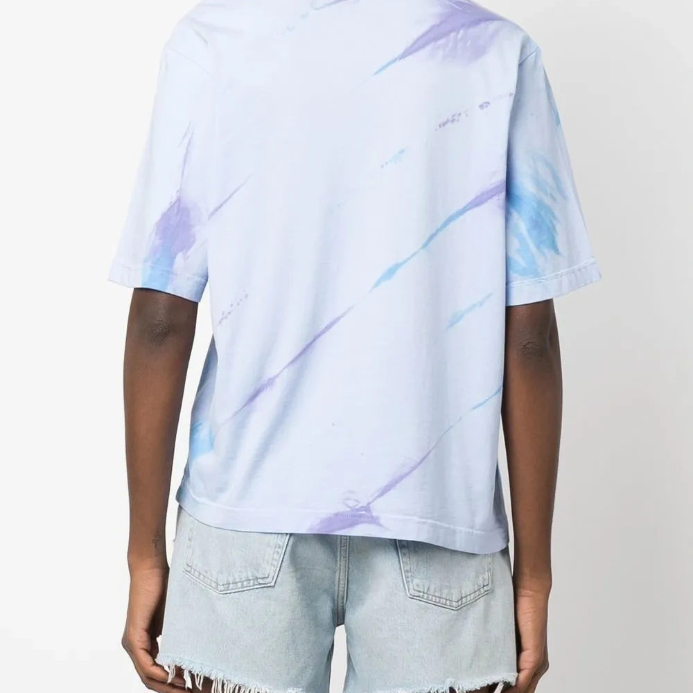 Голубой, хлопок, принт тай-дай, принт с логотипом на груди, круглый вырез и короткие рукава.