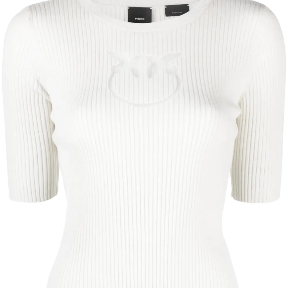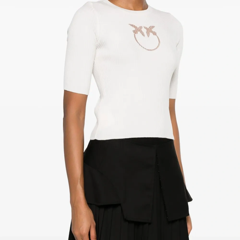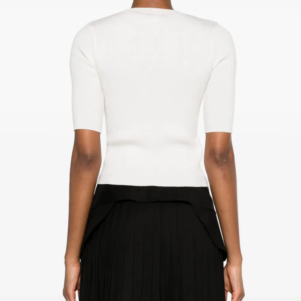 Кремовый, шерсть, трикотажный материал, трикотаж в рубчик, логотип в технике интарсия, круглый вырез, короткие рукава и прямой подол.