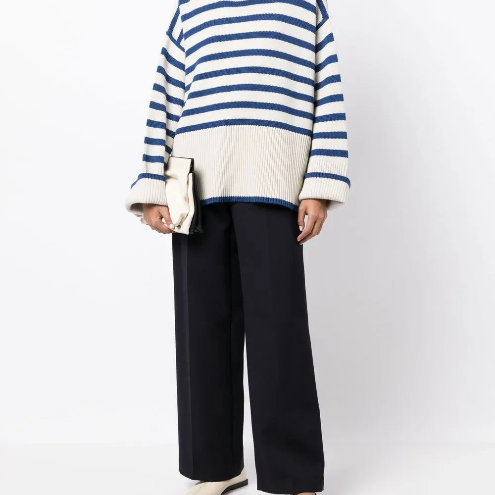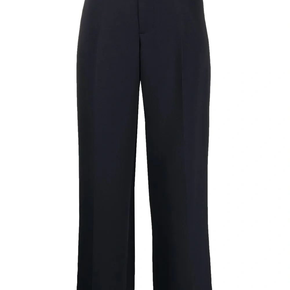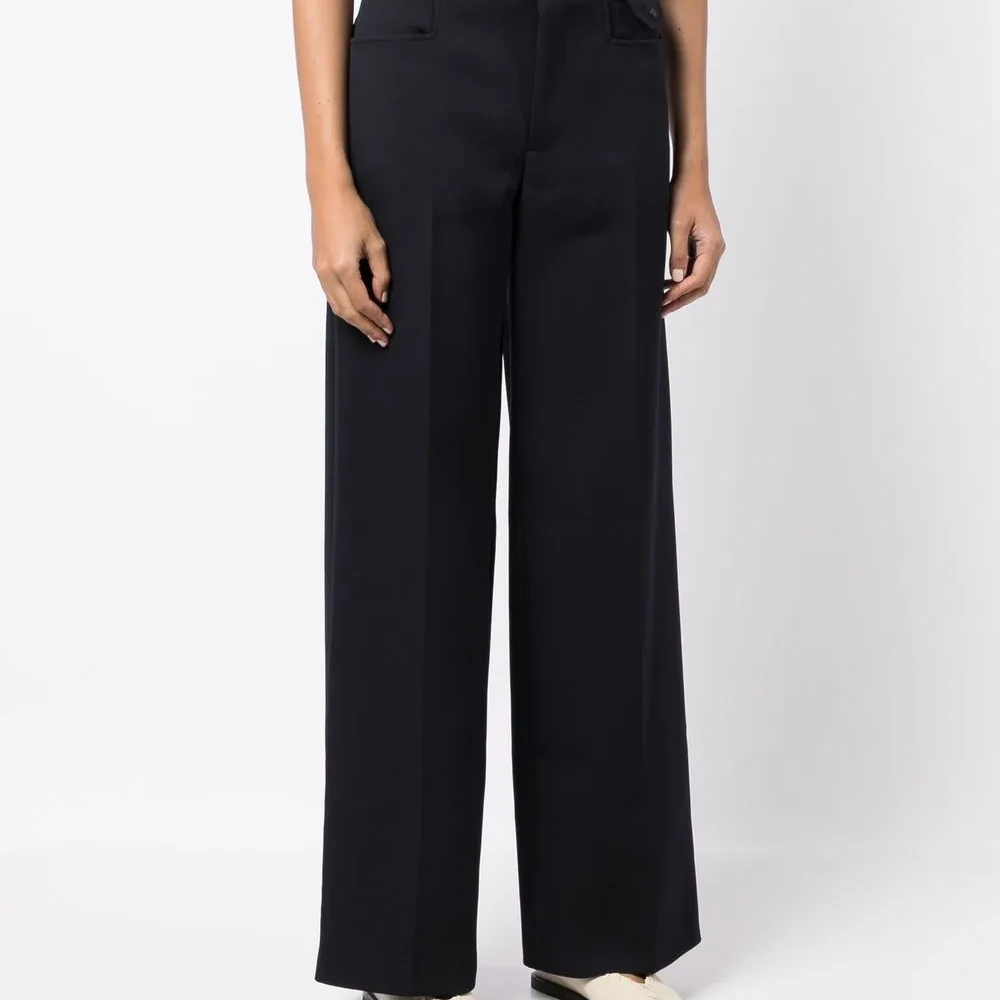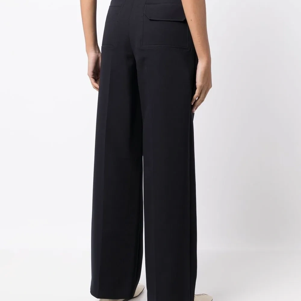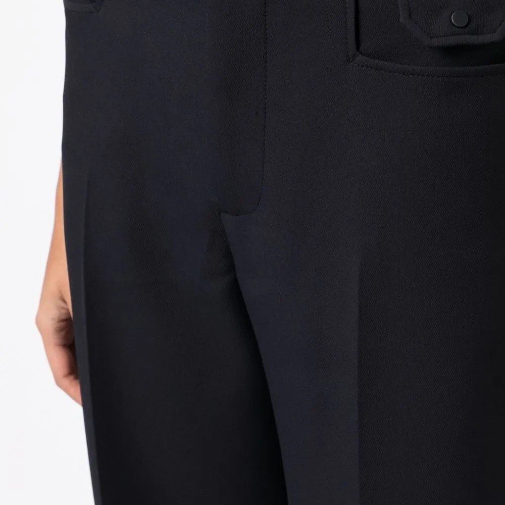Темно-синий, широкий крой, три кармана с клапанами по бокам, завышенная талия и накладной карман сзади.
