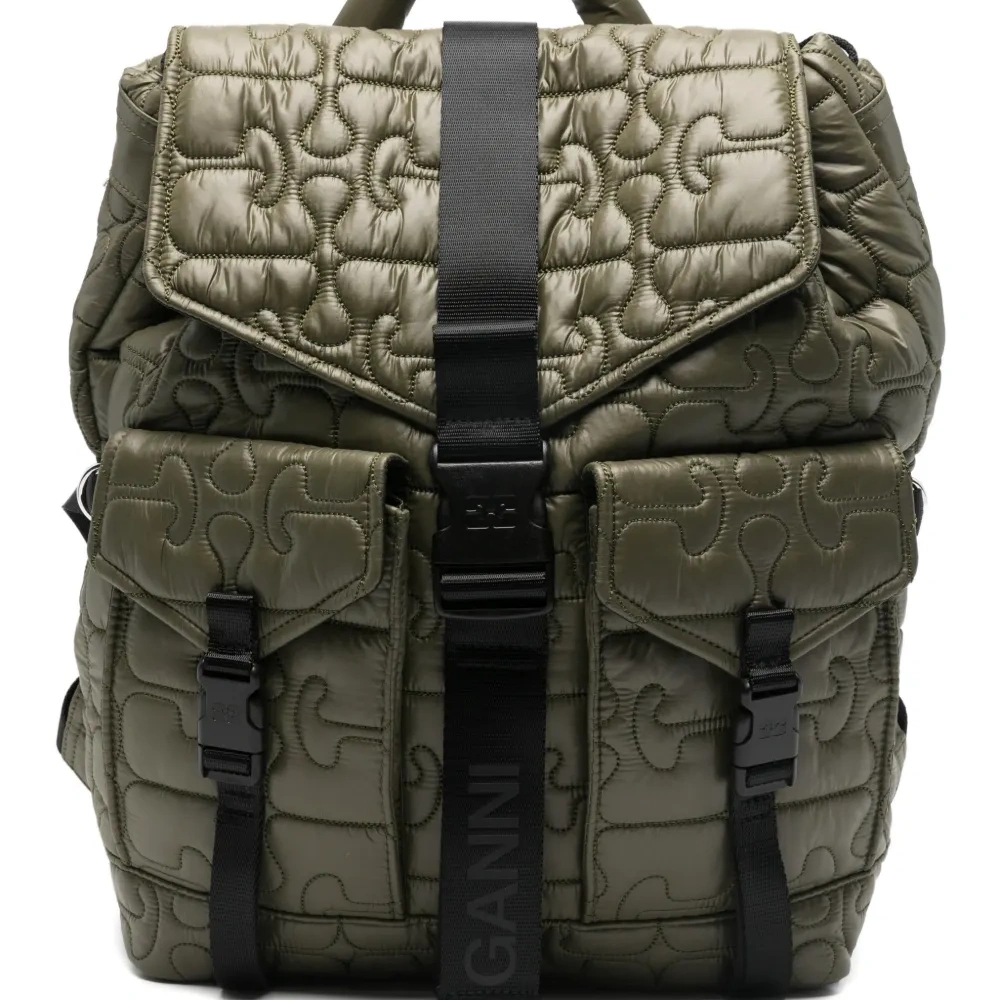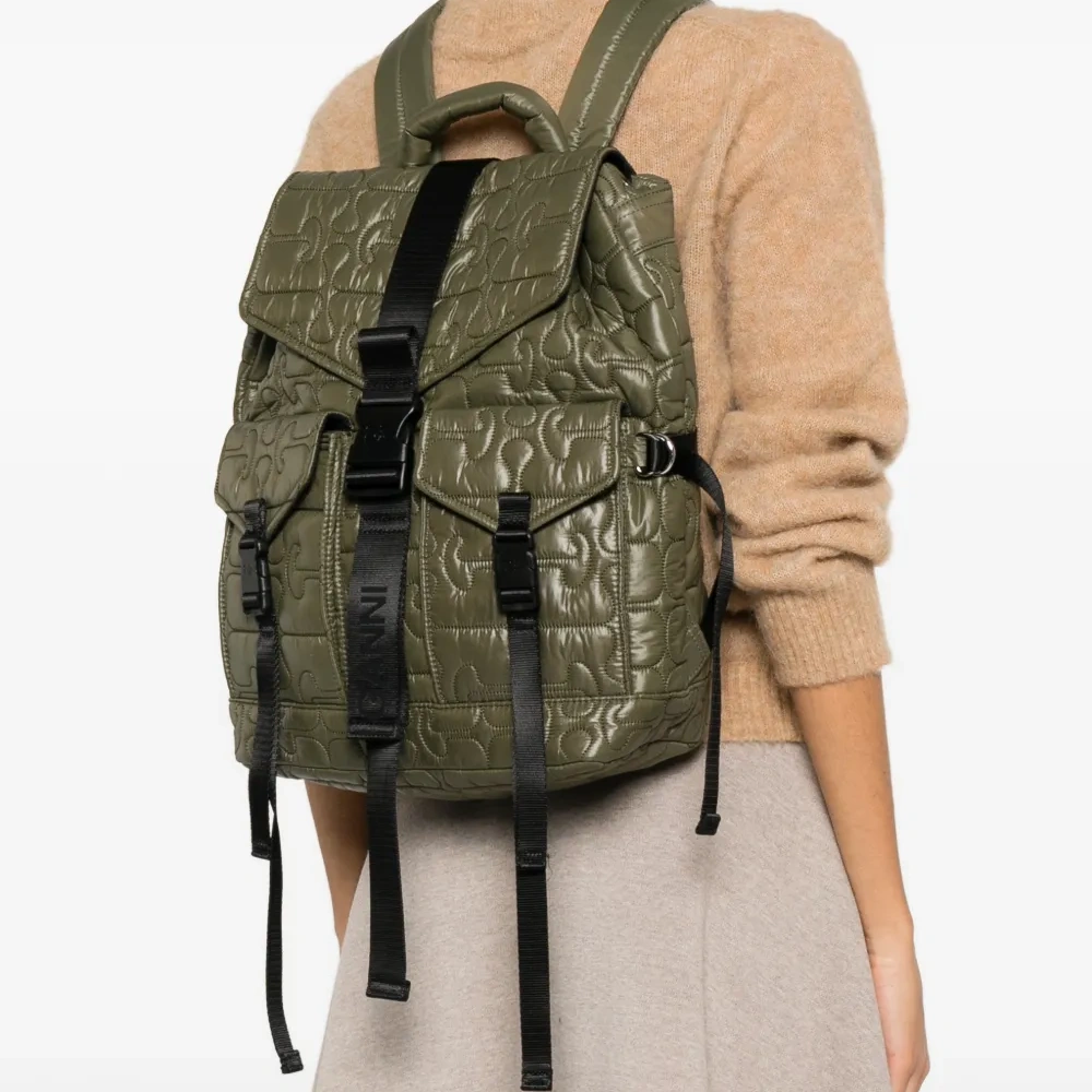 зелёная стёганая сумка с верхней ручкой, застёжкой-пряжкой, двумя передними карманами и регулируемыми плечевыми ремнями