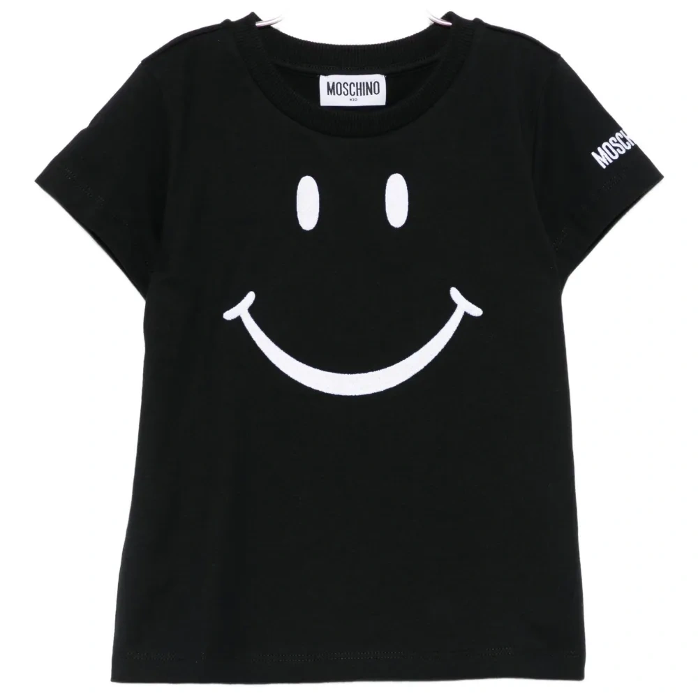 черная футболка из хлопка с мотивом смайлика, короткими рукавами, круглым вырезом и прямым подолом