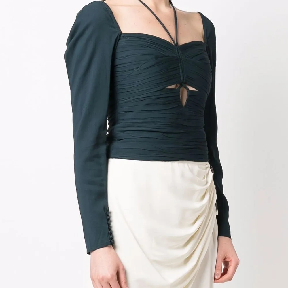 Плиссированная модель, завязки вокруг шеи, вырез в форме сердца, объемные рукава, потайная застежка на молнии сзади и вырезные детали.
