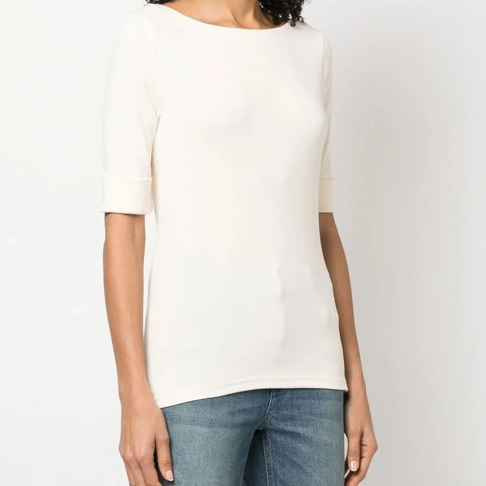 Кремово-белый, эластичный хлопок, вырез-лодочка, короткие рукава с отворотами и прямой подол.