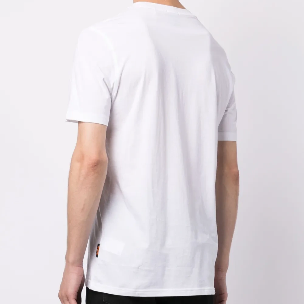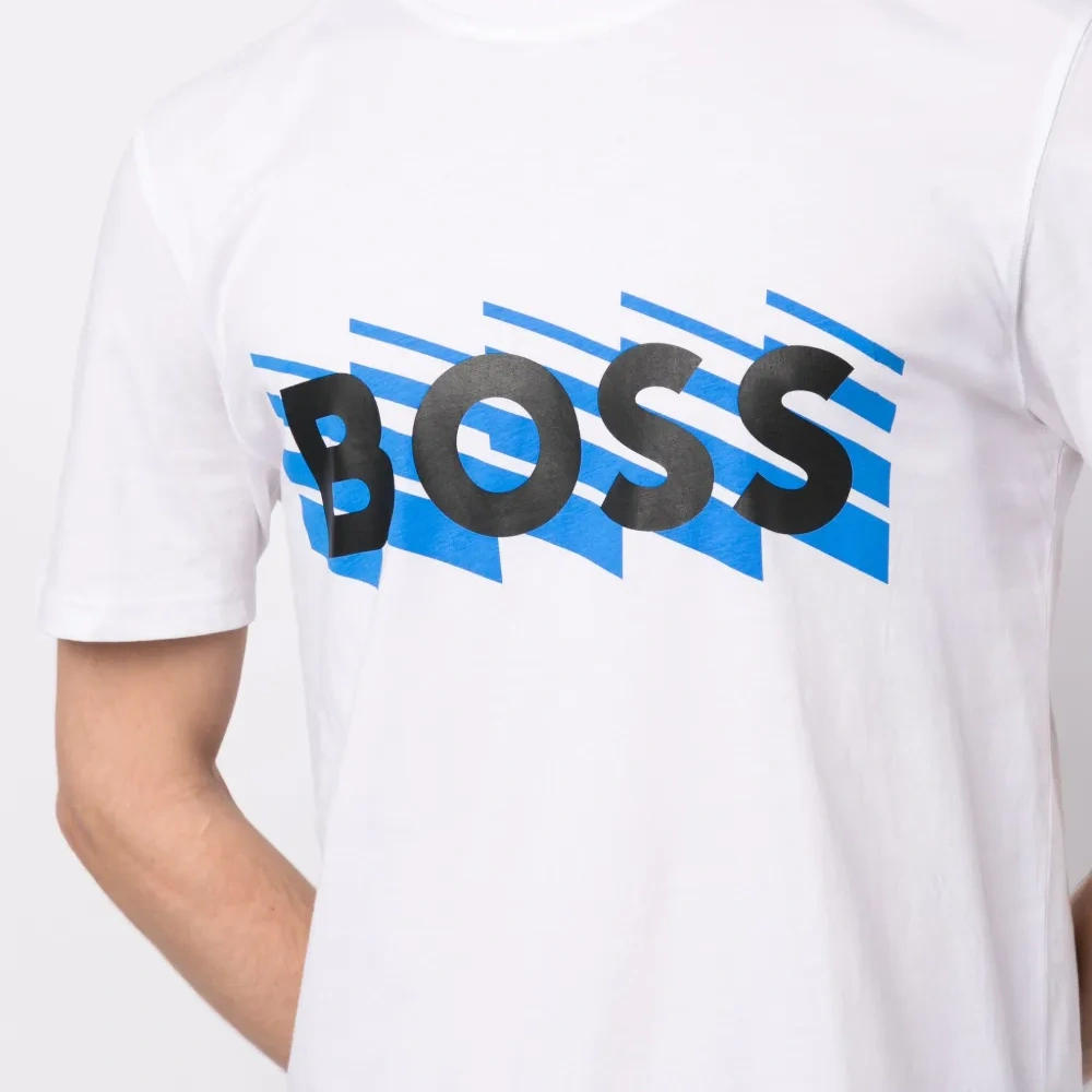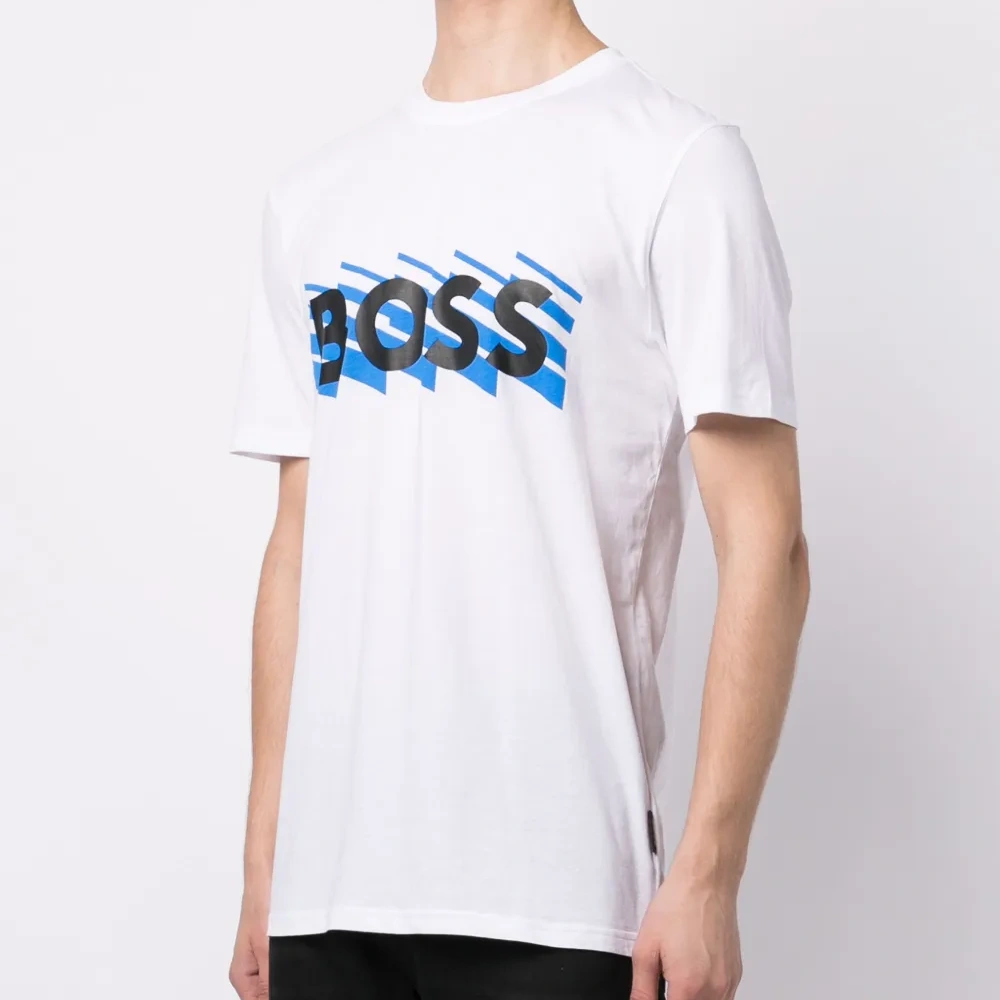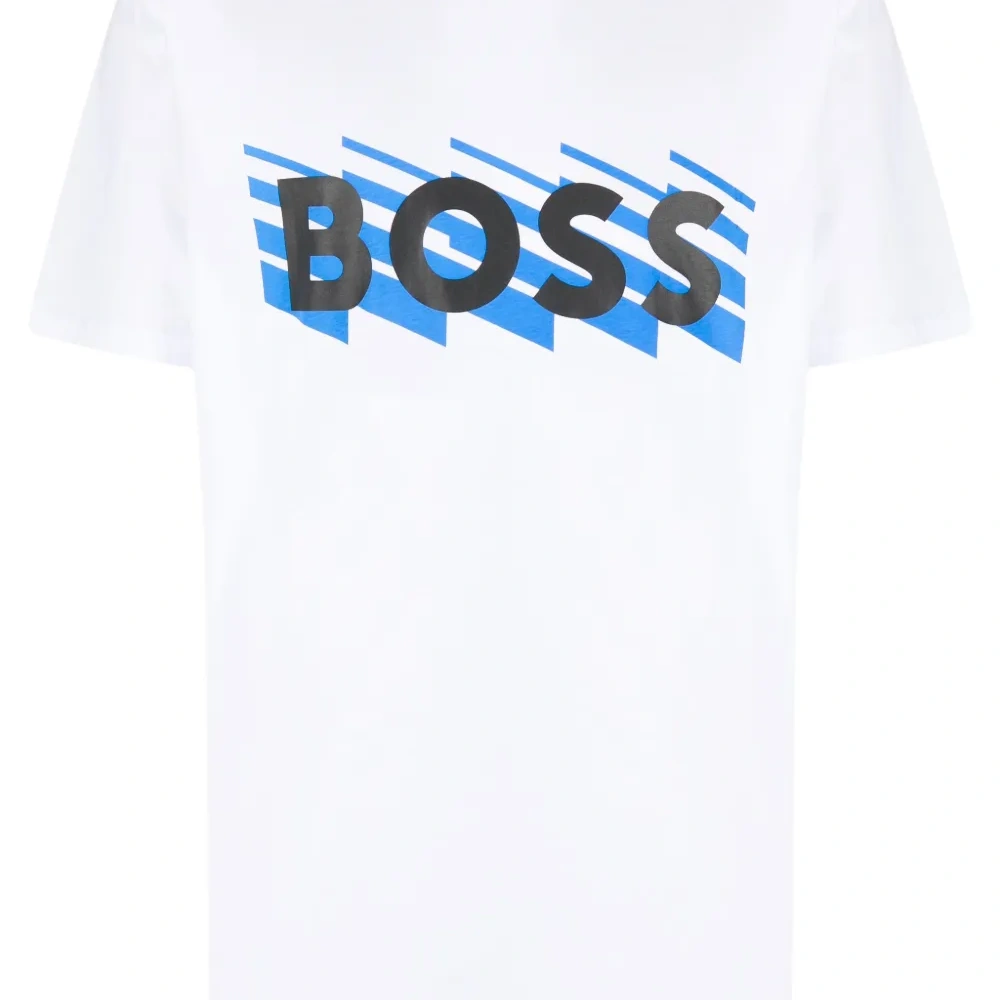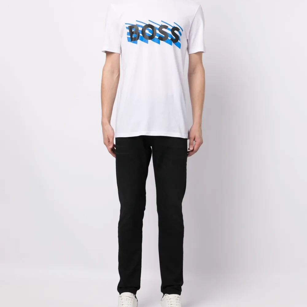 Принт с логотипом на груди, круглый вырез, короткие рукава и прямой подол.