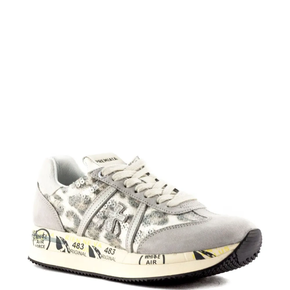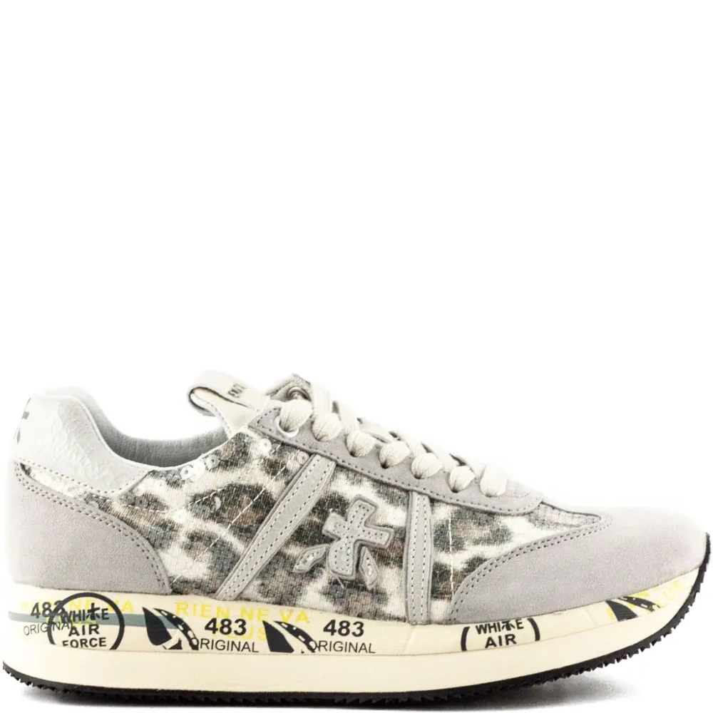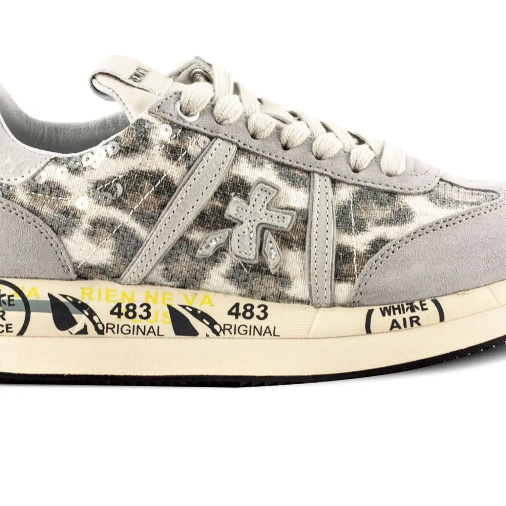 серые кроссовки с леопардовым принтом, украшением из пайеток, замшевыми вставками, резиновой подошвой и шнуровкой