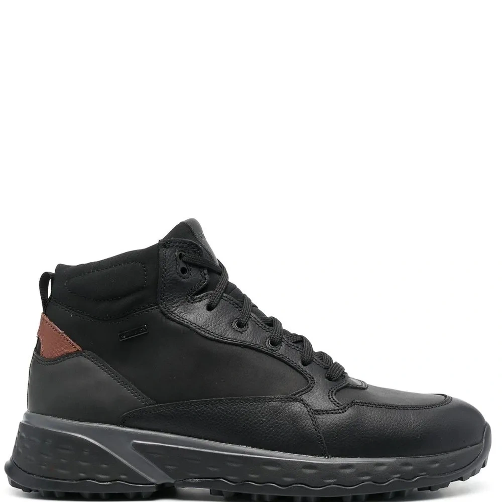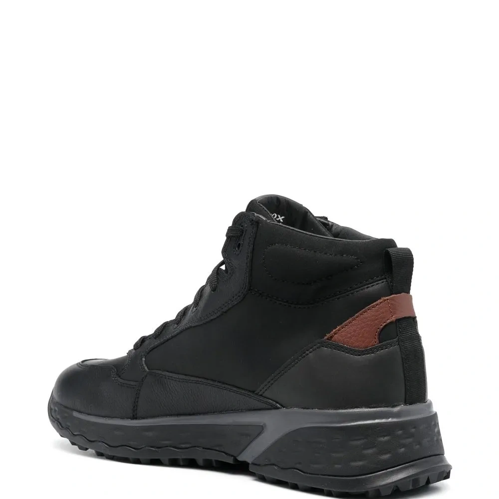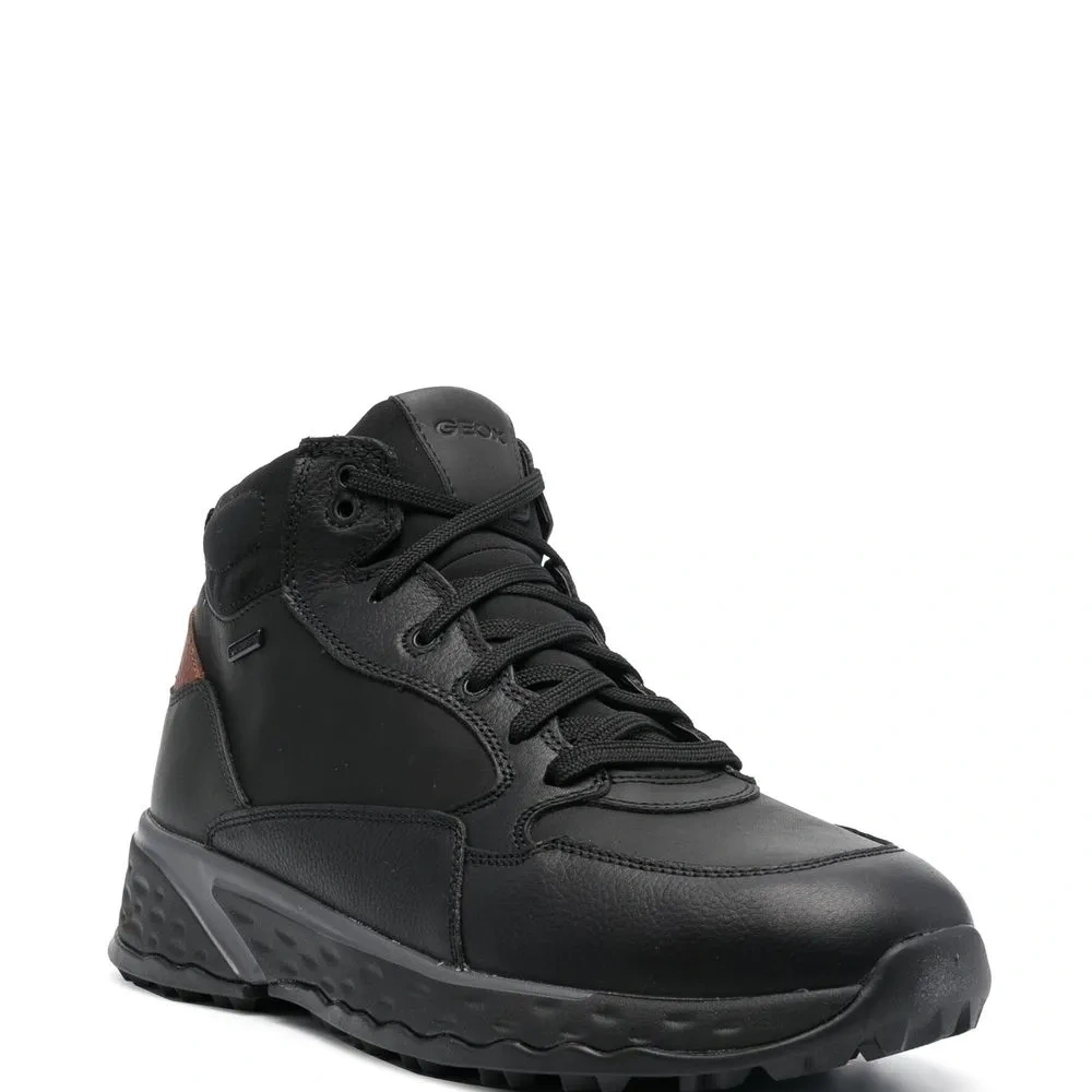 Черный, телячья кожа, шнуровка спереди, закругленный носок, массивная резиновая подошва и низкий каблук.