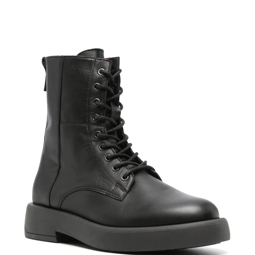 Черный, телячья кожа, металлическая монограмма, серебристая фурнитура, петля для подтягивания сзади, закругленный носок, шнуровка спереди, стелька с логотипом и резиновая подошва.