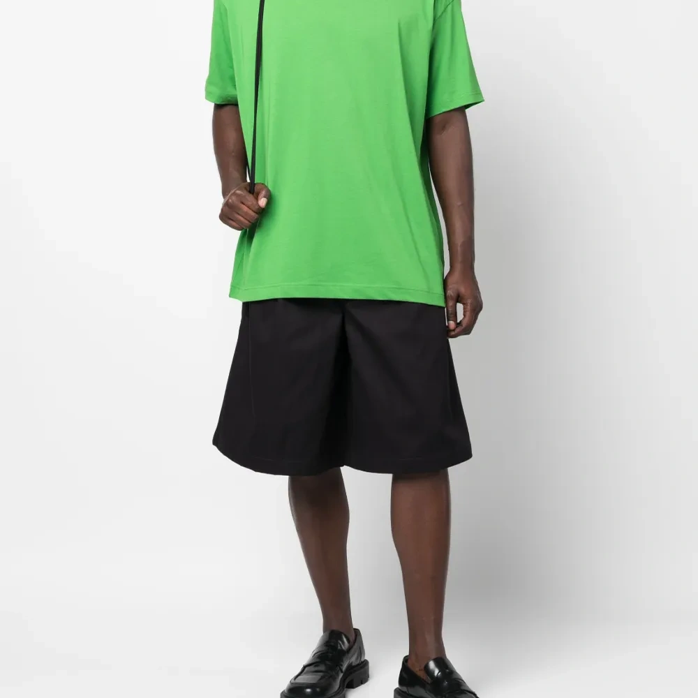 Флуоресцентный зеленый, хлопок, круглый вырез, короткие рукава и прямой подол.