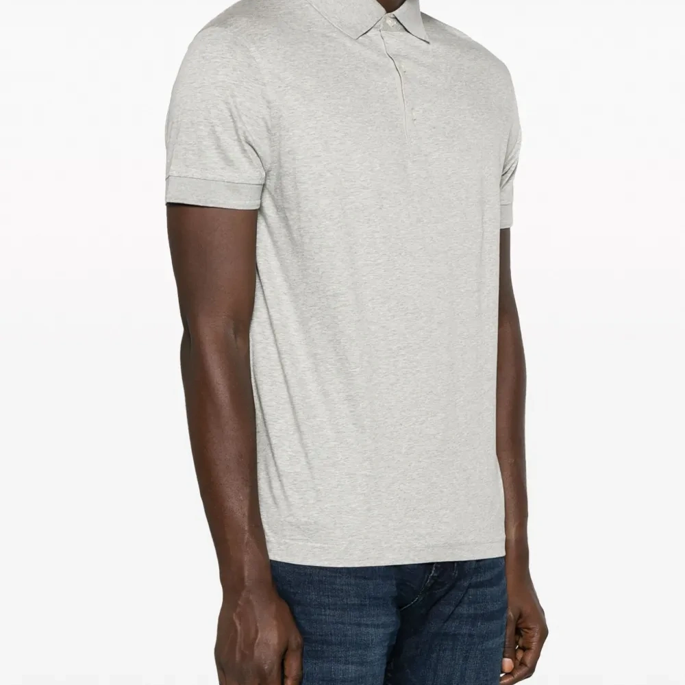 Светло-серый, хлопок, эффект меланж, вышитый логотип на рукаве, воротник поло, планка на пуговицах спереди, короткие рукава и прямой подол.