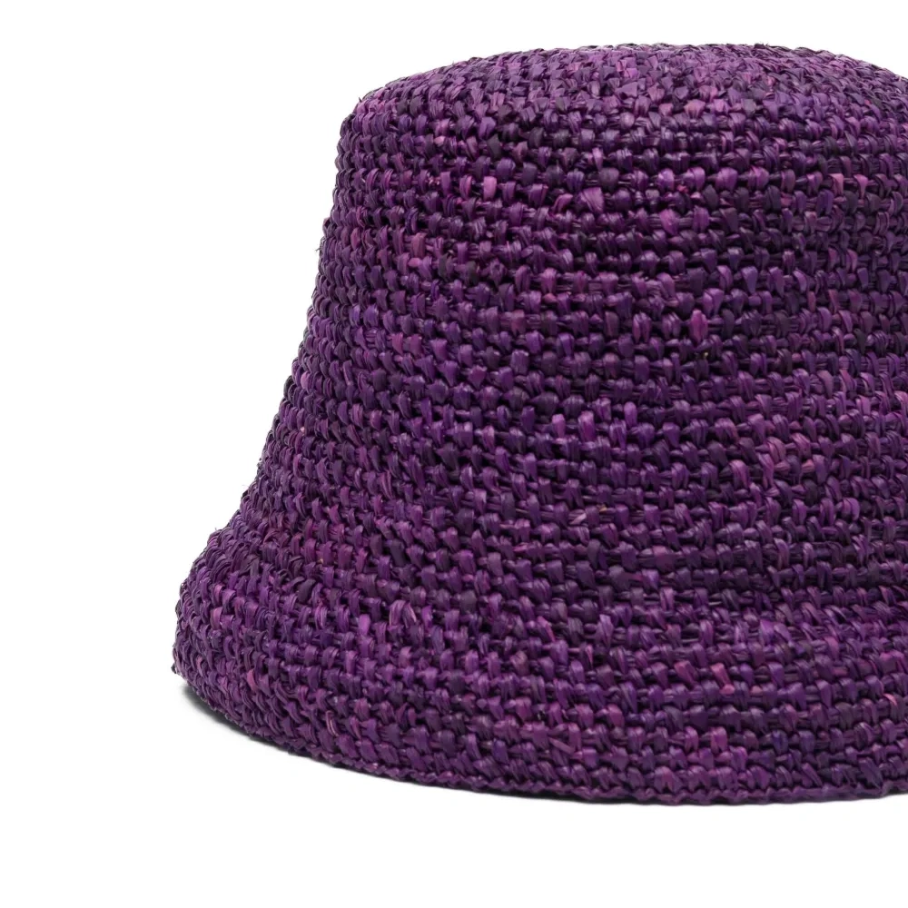 Темно-фиолетовый, плетеный дизайн из рафии, нашивка с логотипом спереди, узкие поля и модель без застежки.