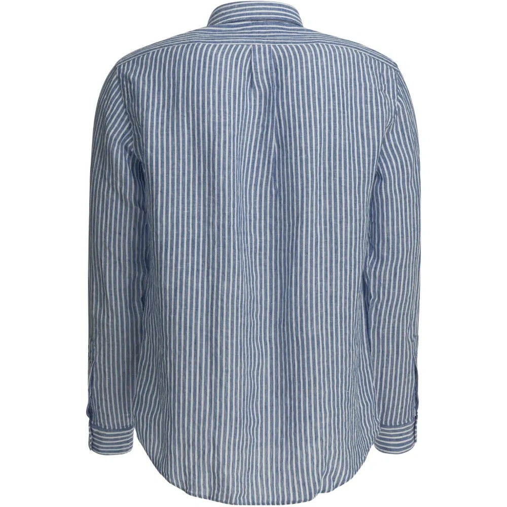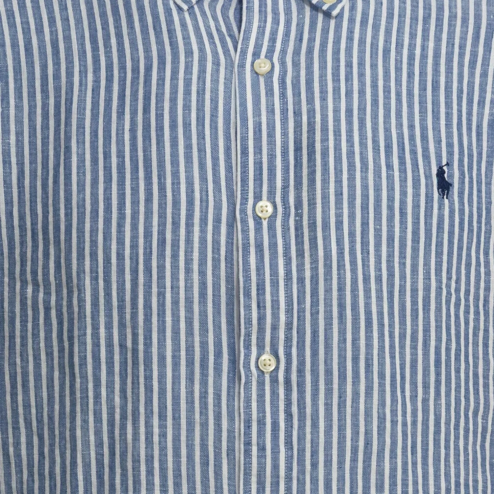 синий и белый вертикальный полосатый узор, застёжка на пуговицы, длинные рукава, вышитый логотип