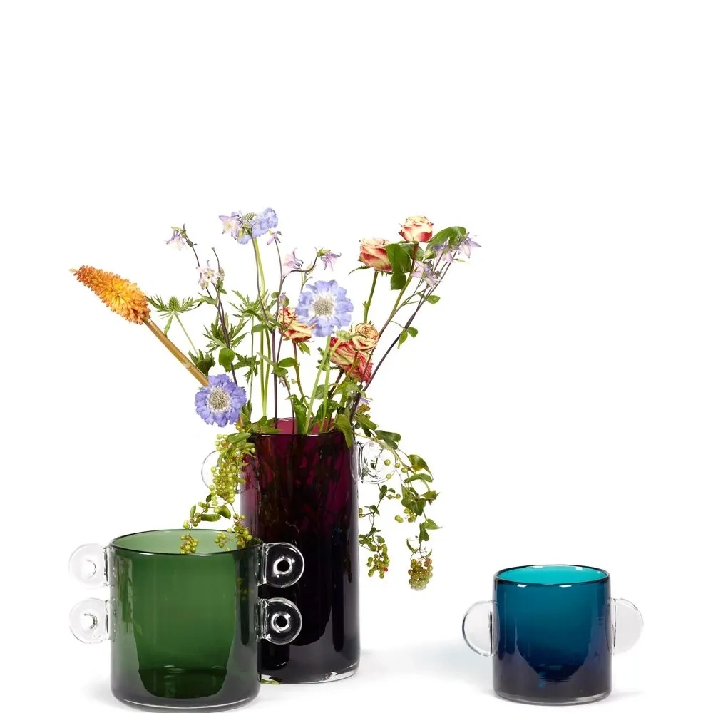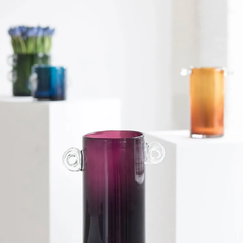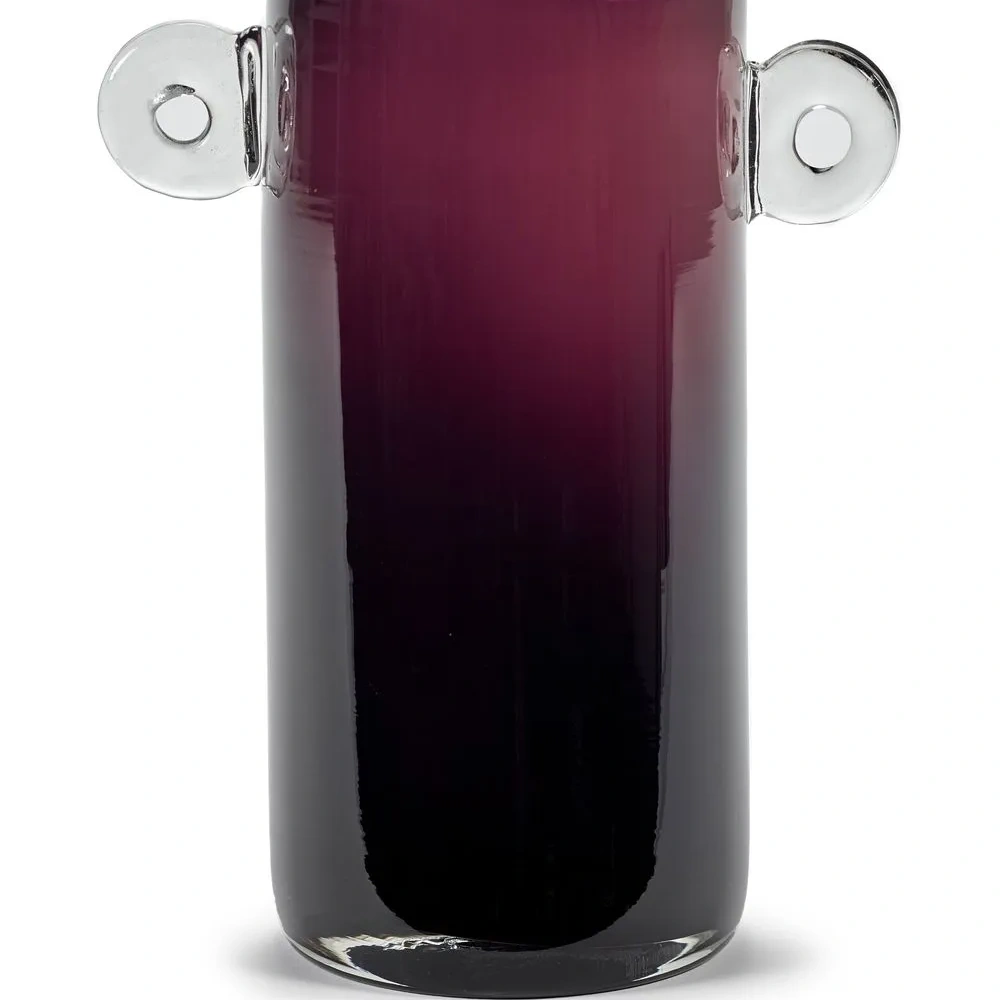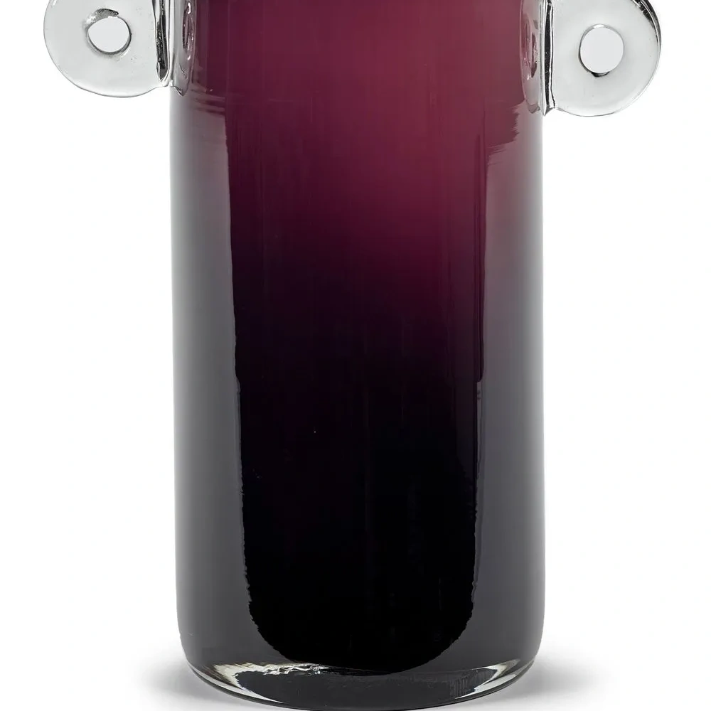 Темно-фиолетовый, стекло, цилиндрический дизайн, прозрачный материал и две закругленные ручки по бокам.