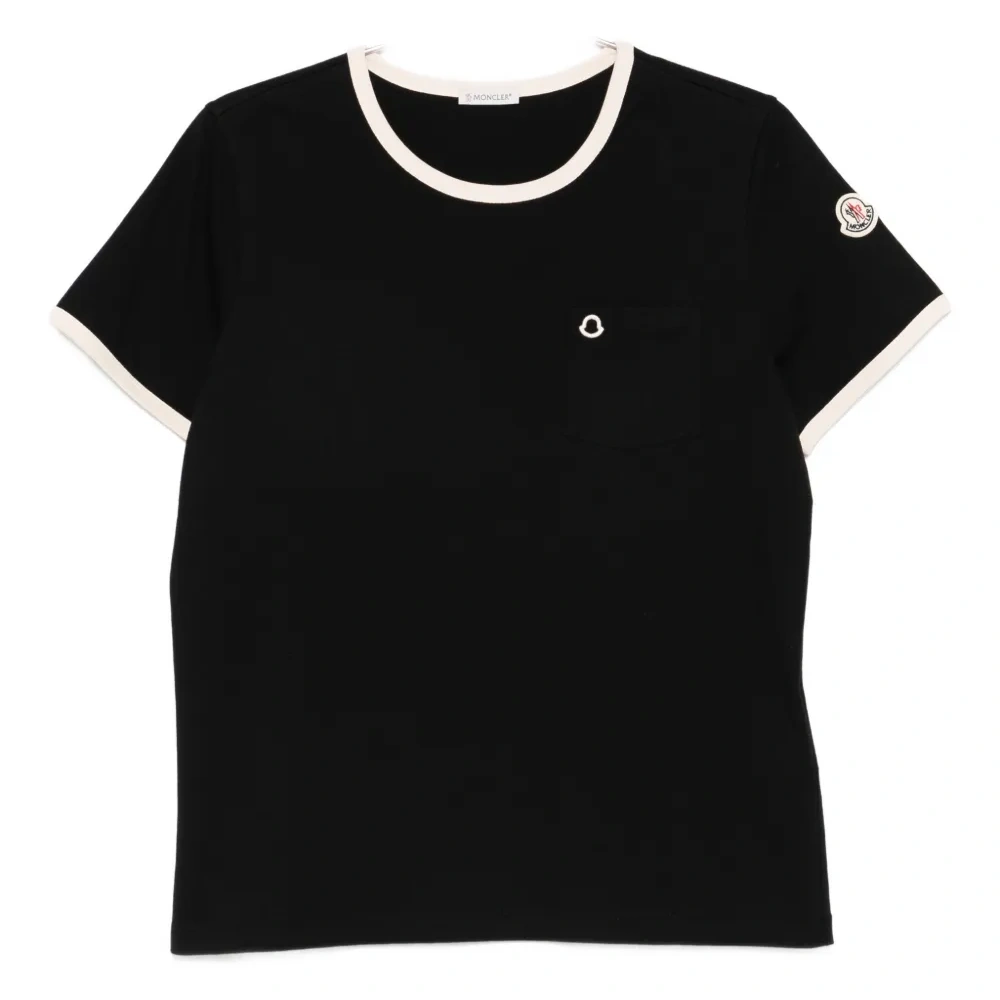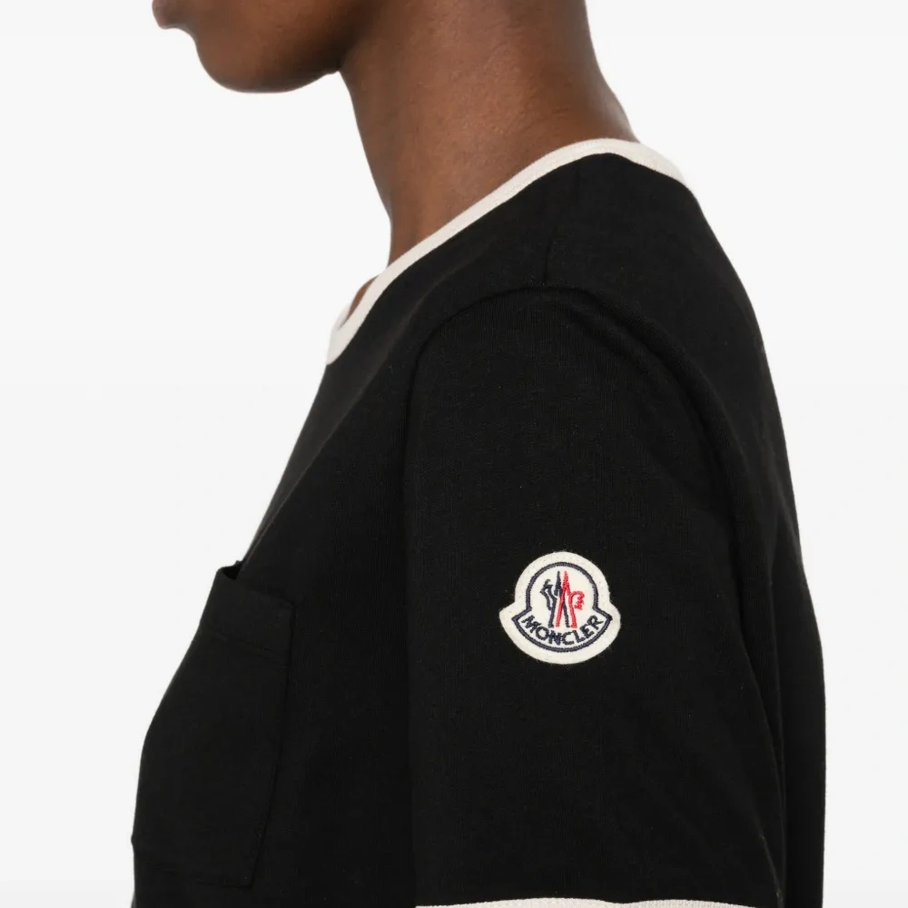 черная футболка с контрастной отделкой, вышивкой логотипа, нагрудным карманом и круглым вырезом