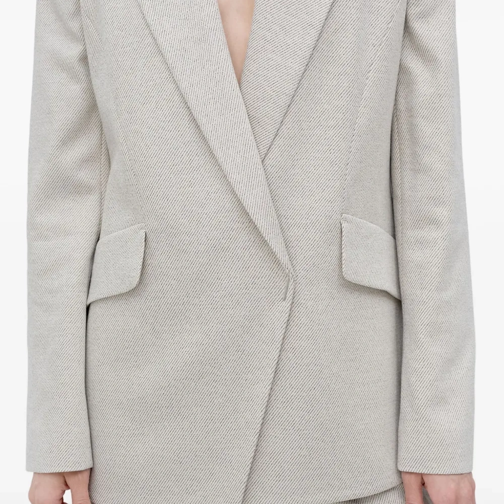светло-серый цвет, пиджак с острыми лацканами, клапанами на карманах, длинными рукавами