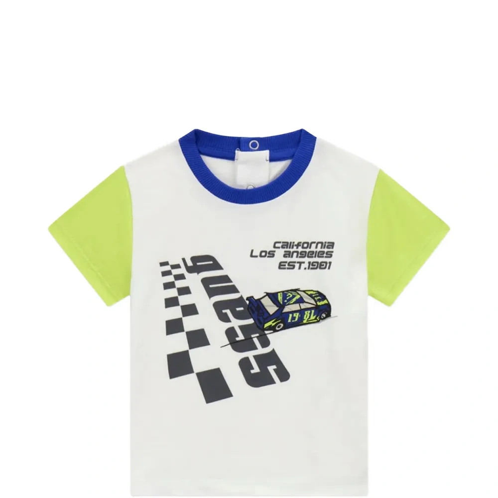 белый/многоцветный, графический принт, дизайн с цветными блоками, круглый вырез, короткие рукава, застежка на кнопки сзади, эластичный пояс, шнурок для регулировки, детали с логотипом